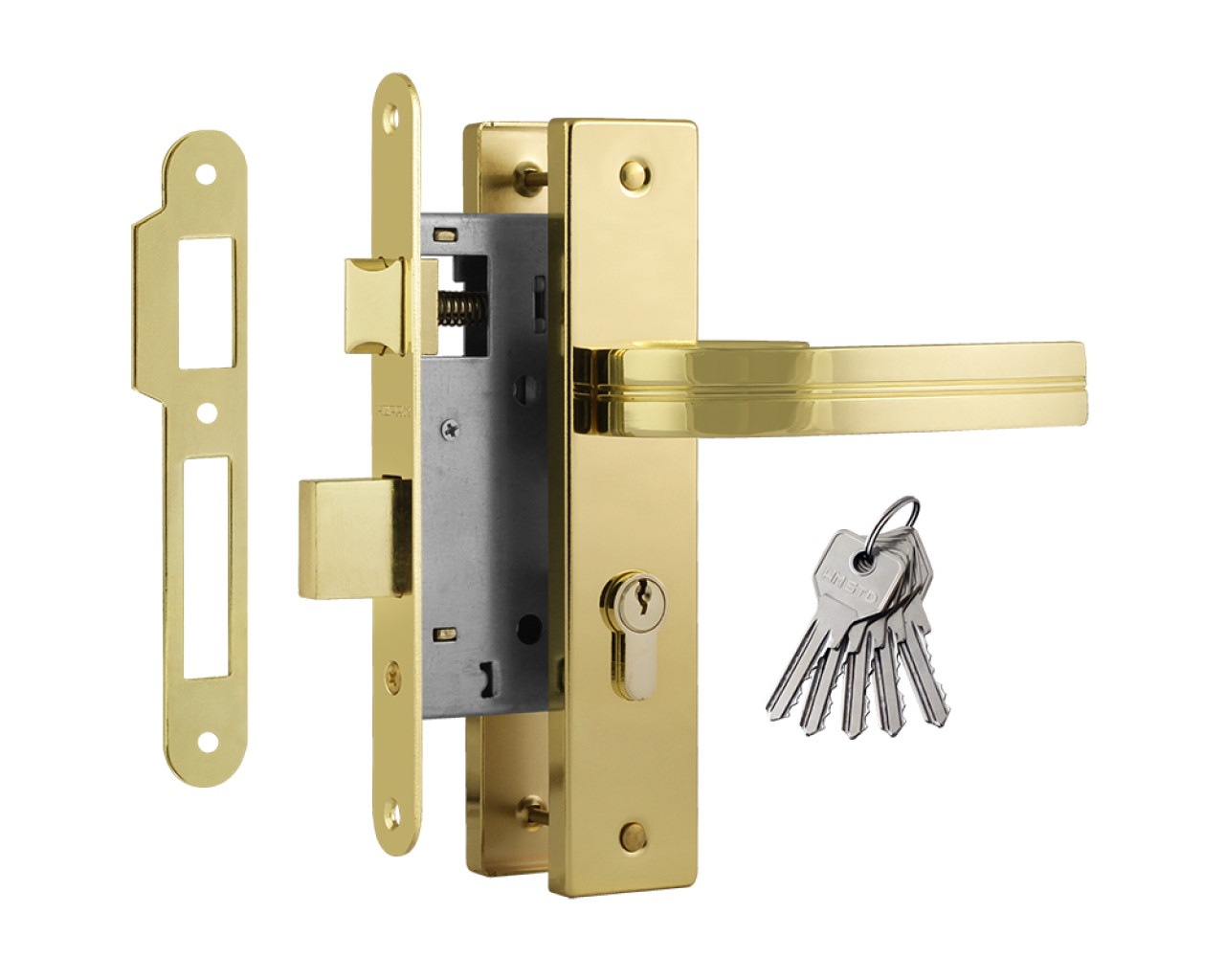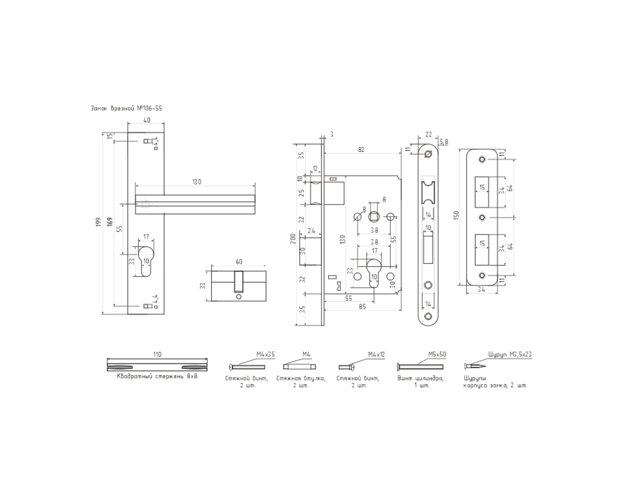 Комплект замка предназначен для установки на межкомнатные и входные двериКомплект состоит из: ручек на планке 2 шт корпуса замка 1 шт цилиндрового механизма 1 шт ключей 5 шт ответной планки 1 шт Также в комплекте идт крепеж для установки корпуса ручек на планке и цилиндраМатериал ручек на планке - сплав алюминия сталь Механизм в ручках - пружина из закаленной стали с повышенным ресурсом работы Покрытие ручек - гальваническое многослойноеМатериал корпуса замка - сталь закаленная сталь Корпус покрыт антикоррозийным составом лицевая планка корпуса имеет гальваническое многослойное покрытиеУпаковка - картонная коробкаМодель 106-55 имеет межосевое расстояние 55 мм Подробные посадочные размеры всех комплектующих смотрите на схемеЗамок универсальный может быть установлен на левые и правые двери Для смены ориентации с левого на правый и наоборот необходимо перевернуть защелку корпуса замка на 180 градусов подробнее смотрите в инструкции