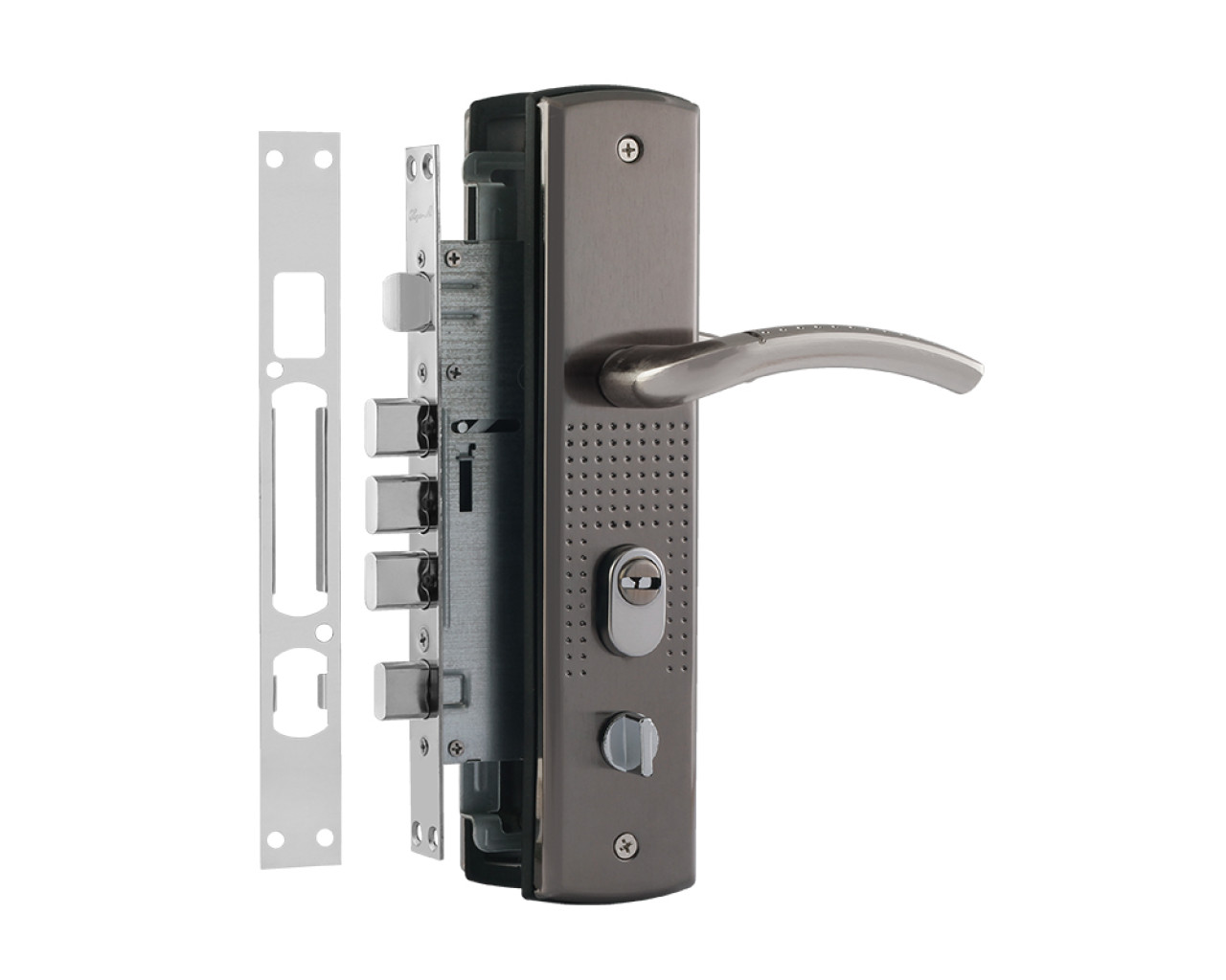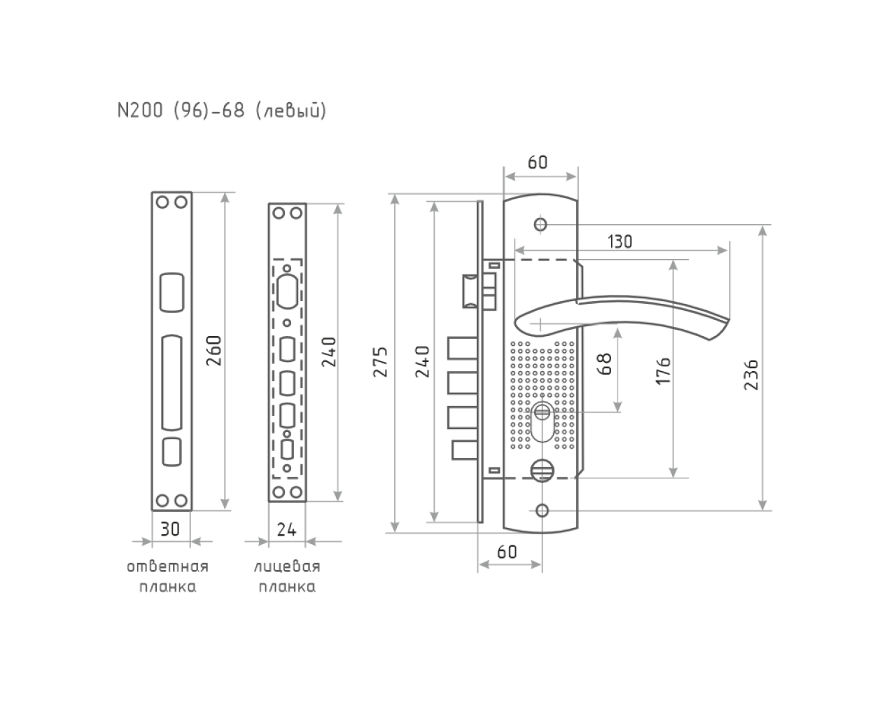 Комплект врезного замка для дверей китайского производства с открыванием на левую сторону Стальной корпус оснащн ригелями из закалнной стали Алюминиевые полноразмерные ручки расположены на стальных планках Гальваническое покрытие наружных элементов обеспечивает защиту от механических повреждений и коррозии Стандартное межосевое расстояние 68 мм позволяет монтировать замок на новые двери или использовать его для замены сломанного устройства в китайских полотнах Бэксет 60 мм Цилиндр в комплект поставки не входит и приобретается отдельно исходя из параметров дверного полотна
