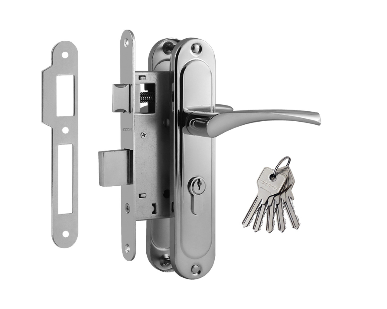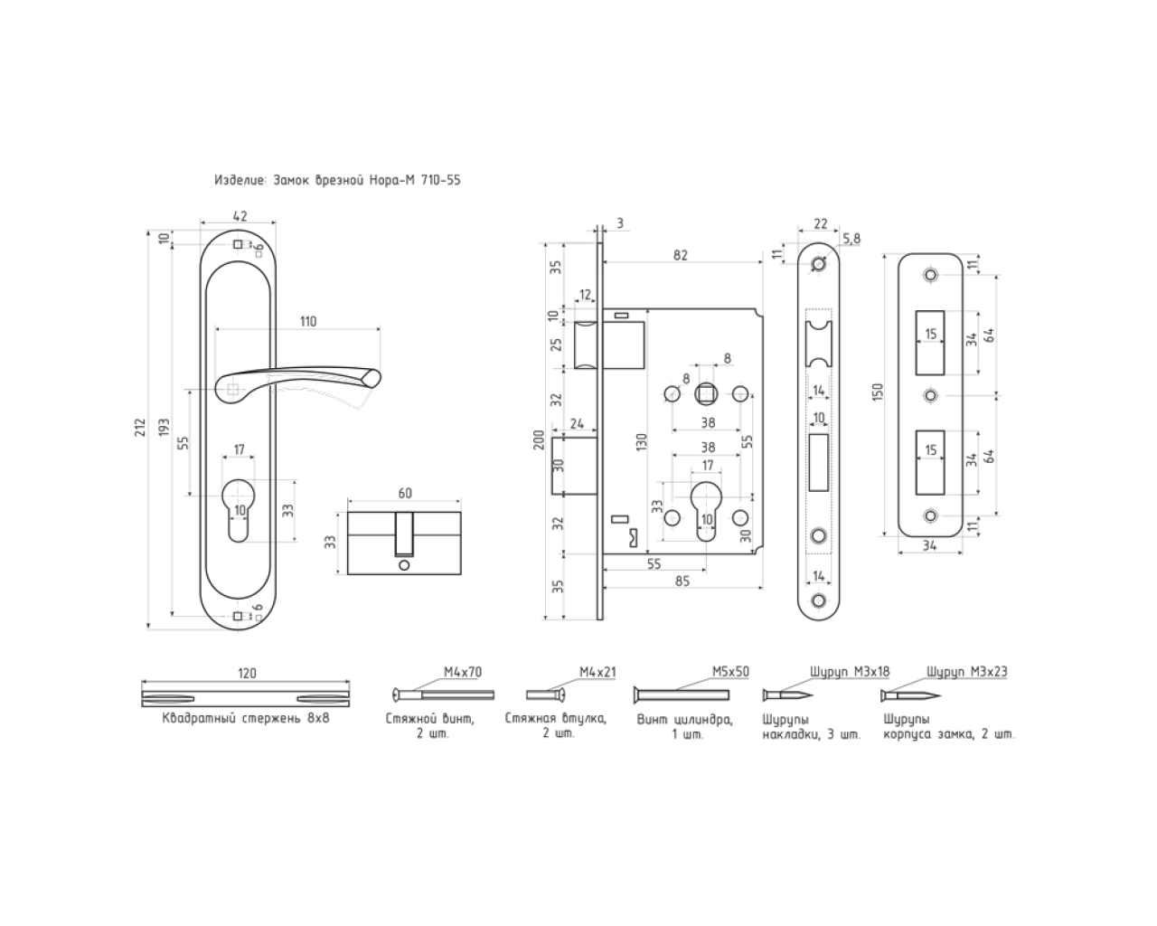 Комплект замка предназначен для установки на межкомнатные и входные двериКомплект состоит из: ручек на планке 2 шт корпуса замка 1 шт цилиндрового механизма 1 шт ключей 5 шт ответной планки 1 шт Также в комплекте идт крепеж для установки корпуса ручек на планке и цилиндраМатериал ручек на планке - сплав алюминия сталь Механизм в ручках - пружина из закаленной стали с повышенным ресурсом работы Покрытие ручек - гальваническое многослойноеМатериал корпуса замка - сталь закаленная сталь Корпус покрыт антикоррозийным составом лицевая планка корпуса имеет гальваническое многослойное покрытиеУпаковка - картонная коробкаМодель 106-55 имеет межосевое расстояние 55 мм Подробные посадочные размеры всех комплектующих смотрите на схемеЗамок универсальный может быть установлен на левые и правые двери Для смены ориентации с левого на правый и наоборот необходимо перевернуть защелку корпуса замка на 180 градусов подробнее смотрите в инструкции