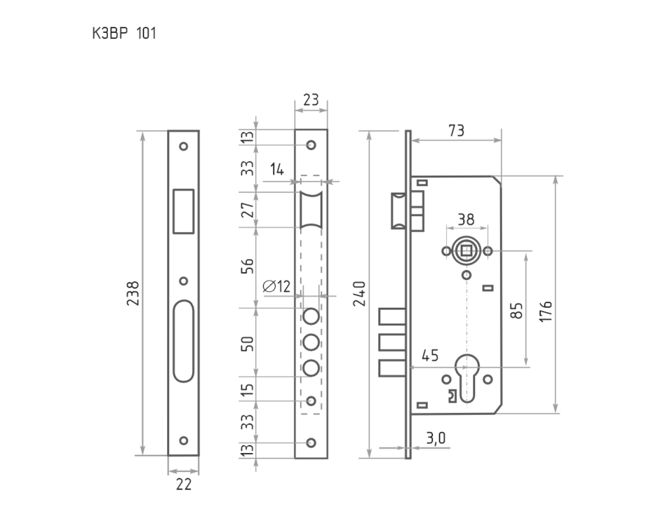 Корпус врезного замка КЗВР-101 устанавливается на деревянные входные и межкомнатные двери для комплектации с цилиндровым механизмом накладкой под цилиндр и ручкой Материал изготовления сталь Корпус имеет порошковое покрытие придающее дополнительную защиту от коррозии Запорные элементы собачка и три круглых ригеля Межосевое расстояние составляет 85 мм Универсальная конструкция корпуса КЗВР-101 подходит для установки на левые и правые двериМодель оснащена подшипником обеспечивающим более долговечную эксплуатацию замка дверного врезного а также более плавный поворот ручки Лицевая и ответная планки имеют гальваническое покрытие которое защищает металл от коррозии и механических повреждений
