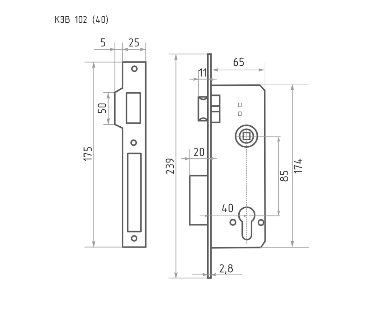 Корпус замка врезной модели 102 40мм предназначен для установки в деревянные входные двери Запирается при помощи цилиндра приобретается отдельно Межосевое расстояние 85 мм Бэксет 40 мм Отверстие под квадрат ручки 88 мм Может быть скомплектован как с дверными ручками на розетке так и с ручками на планке ручки приобретаются отдельно Корпус выполнен из стали механизм из закаленной стали Корпус имеет антикоррозийное покрытие лицевая и ответные планки покрыты гальваническим способом Крепеж в комплекте