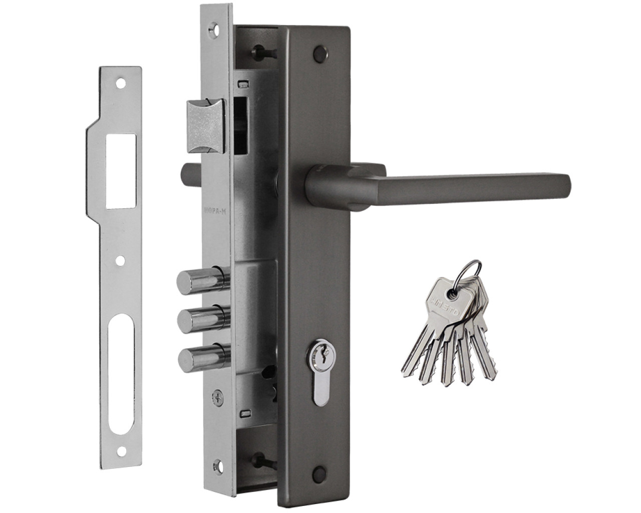 омплект замка предназначен для установки на межкомнатные и входные двериКомплект состоит из: ручек на планке 2 шт корпуса замка 1 шт цилиндрового механизма 1 шт ключей 5 шт ответной планки 1 шт Также в комплекте идт крепеж для установки корпуса ручек на планке и цилиндраМатериал ручек на планке - сплав алюминия сталь Механизм в ручках - пружина из закаленной стали с повышенным ресурсом работы Покрытие ручек - гальваническое многослойноеМатериал корпуса замка - сталь закаленная сталь Корпус покрыт антикоррозийным составом лицевая планка корпуса имеет гальваническое многослойное покрытиеУпаковка - картонная коробкаМодель 108-85 М имеет межосевое расстояние 85 мм Подробные посадочные размеры всех комплектующих смотрите на схемеЗамок универсальный может быть установлен на левые и правые двери Для смены ориентации с левого на правый и наоборот необходимо перевернуть защелку корпуса замка на 180 градусов подробнее смотрите в инструкции