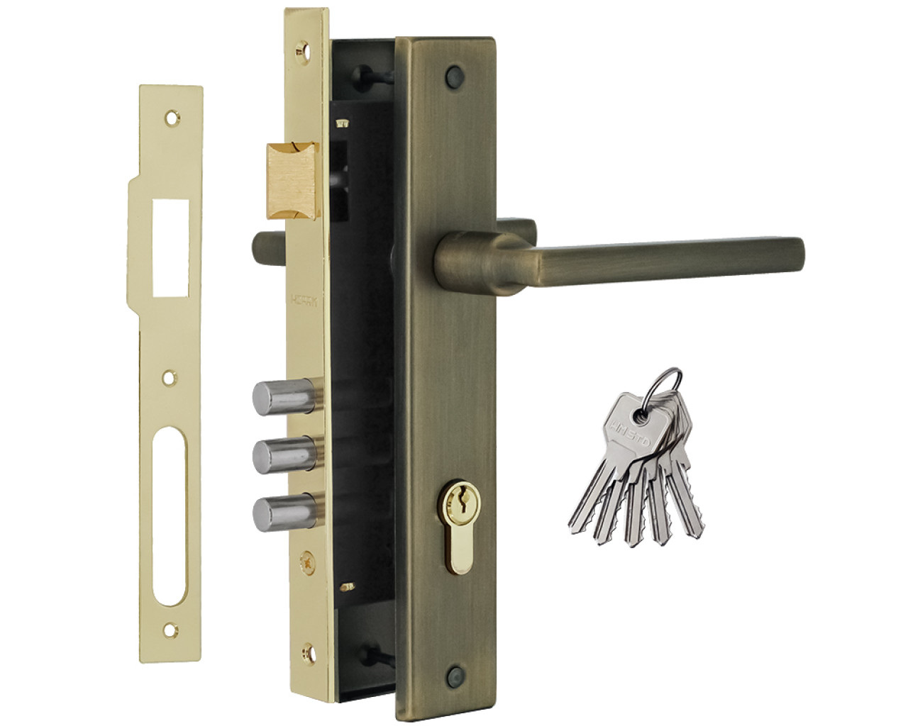 омплект замка предназначен для установки на межкомнатные и входные двериКомплект состоит из: ручек на планке 2 шт корпуса замка 1 шт цилиндрового механизма 1 шт ключей 5 шт ответной планки 1 шт Также в комплекте идт крепеж для установки корпуса ручек на планке и цилиндраМатериал ручек на планке - сплав алюминия сталь Механизм в ручках - пружина из закаленной стали с повышенным ресурсом работы Покрытие ручек - гальваническое многослойноеМатериал корпуса замка - сталь закаленная сталь Корпус покрыт антикоррозийным составом лицевая планка корпуса имеет гальваническое многослойное покрытиеУпаковка - картонная коробкаМодель 108-85 М имеет межосевое расстояние 85 мм Подробные посадочные размеры всех комплектующих смотрите на схемеЗамок универсальный может быть установлен на левые и правые двери Для смены ориентации с левого на правый и наоборот необходимо перевернуть защелку корпуса замка на 180 градусов подробнее смотрите в инструкции