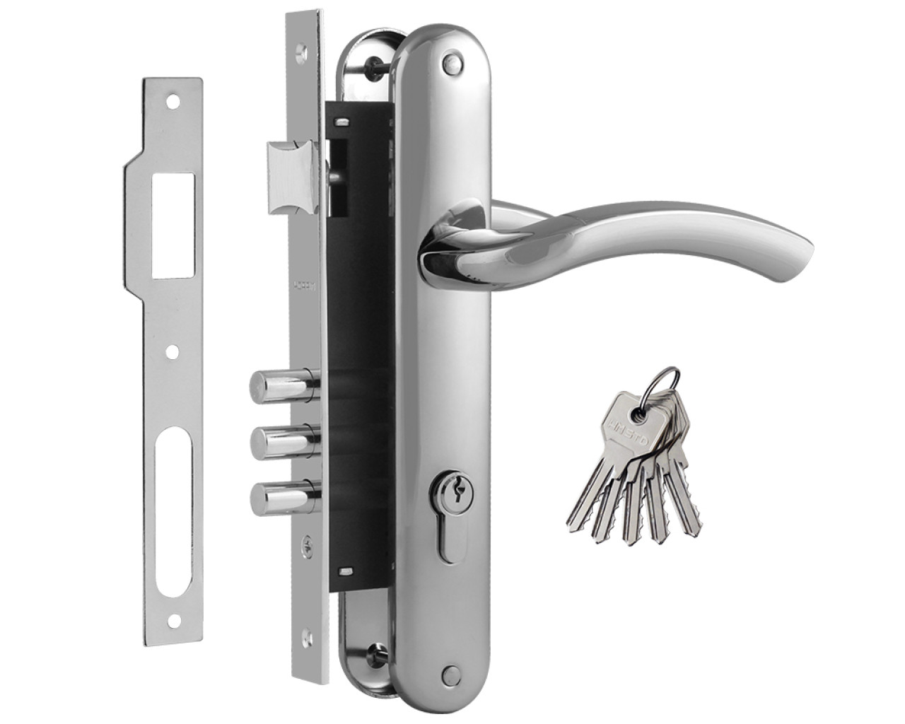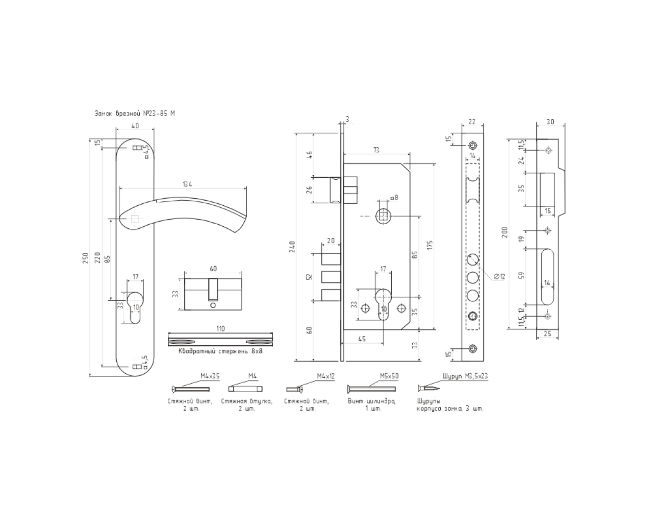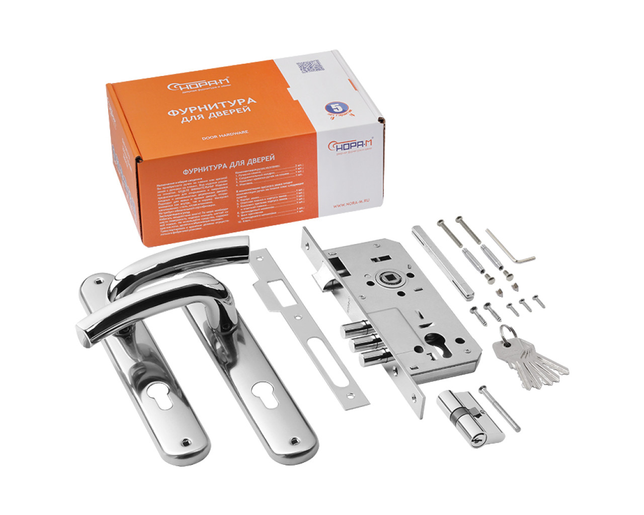 Комплект замка предназначен для установки на межкомнатные и входные двериКомплект состоит из: ручек на планке 2 шт корпуса замка 1 шт цилиндрового механизма 1 шт ключей 5 шт ответной планки 1 шт Также в комплекте идт крепеж для установки корпуса ручек на планке и цилиндраМатериал ручек на планке - сплав алюминия сталь Механизм в ручках - пружина из закаленной стали с повышенным ресурсом работы Покрытие ручек - гальваническое многослойноеМатериал корпуса замка - сталь закаленная сталь Корпус покрыт антикоррозийным составом лицевая планка корпуса имеет гальваническое многослойное покрытиеУпаковка - картонная коробкаМодель 23-85 М имеет межосевое расстояние 85 мм Подробные посадочные размеры всех комплектующих смотрите на схемеЗамок универсальный может быть установлен на левые и правые двери Для смены ориентации с левого на правый и наоборот необходимо перевернуть защелку корпуса замка на 180 градусов подробнее смотрите в инструкции