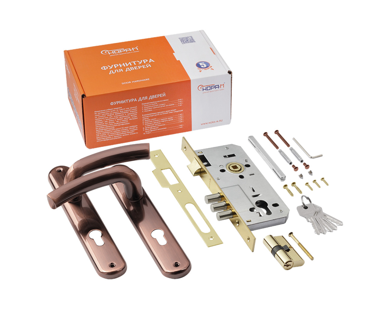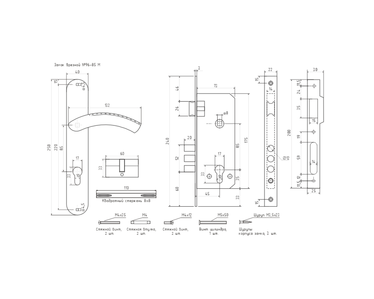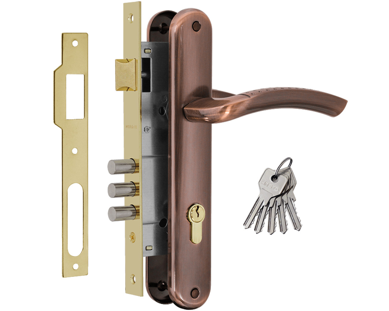 Комплект замка предназначен для установки на межкомнатные и входные двериКомплект состоит из: ручек на планке 2 шт корпуса замка 1 шт цилиндрового механизма 1 шт ключей 5 шт ответной планки 1 шт Также в комплекте идт крепеж для установки корпуса ручек на планке и цилиндраМатериал ручек на планке - сплав алюминия сталь Механизм в ручках - пружина из закаленной стали с повышенным ресурсом работы Покрытие ручек - гальваническое многослойноеМатериал корпуса замка - сталь закаленная сталь Корпус покрыт антикоррозийным составом лицевая планка корпуса имеет гальваническое многослойное покрытиеУпаковка - картонная коробкаМодель 96-85 М имеет межосевое расстояние 85 мм Подробные посадочные размеры всех комплектующих смотрите на схемеЗамок универсальный может быть установлен на левые и правые двери Для смены ориентации с левого на правый и наоборот необходимо перевернуть защелку корпуса замка на 180 градусов подробнее смотрите в инструкции