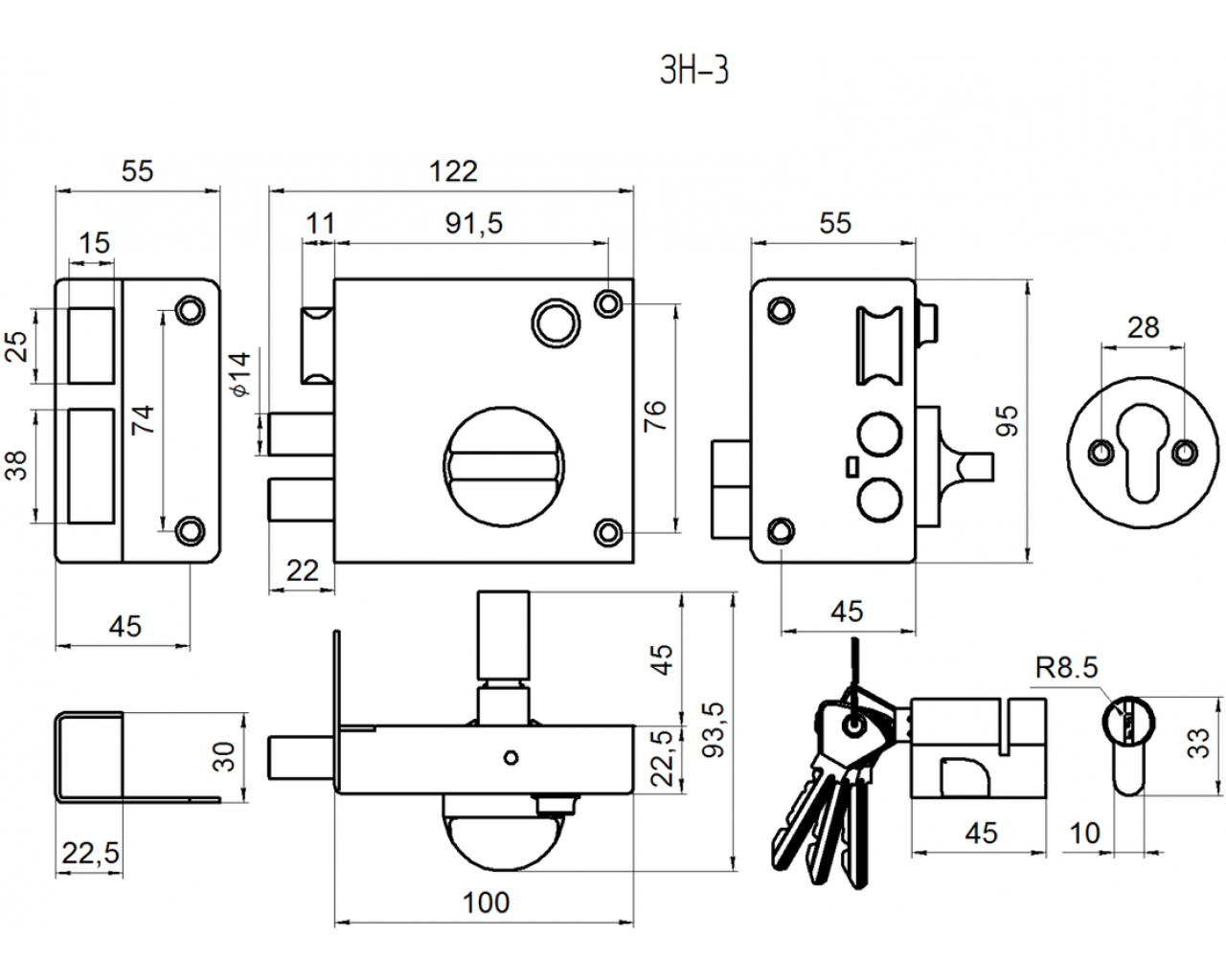 Накладной замок со стальным корпусомОснащен защелкой и двумя стальными ригелями диаметром 14 ммОбладает повышенной секретностьюСоответствует 2 классу по ГОСТ5089-2011