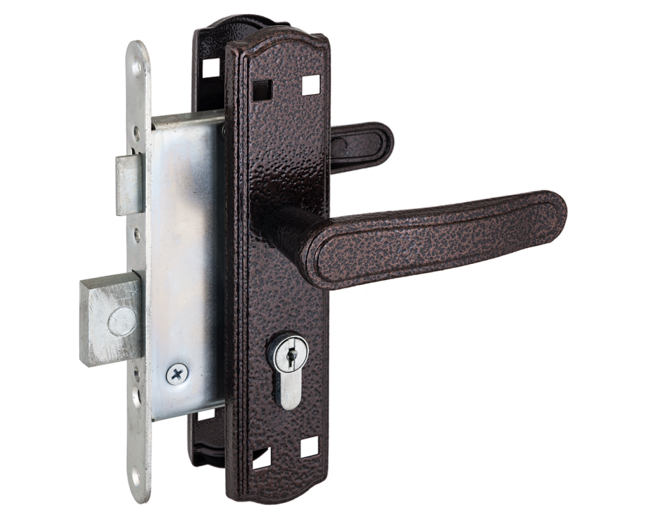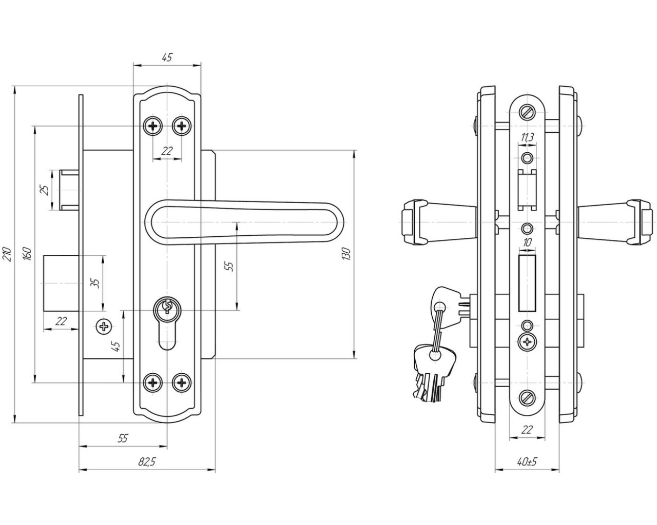 Ручки оснащены усиленными пружинами и стяжками имеют 4 точки крепления Комплектуется цилиндровым механизмом длиной 70 ммПо посадочным размерам совместим с замками белорусского производства