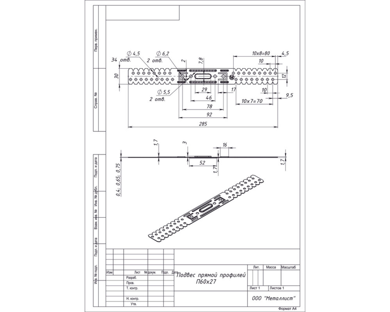 Подвес прямой проф П60*27 (0.65мм) цинк 14680039970920