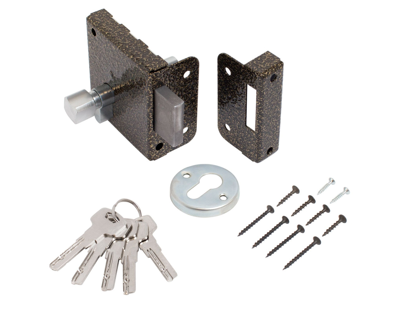 Замок накладной с цилиндровым механизмом. Предназначен для установки на деревянные и легкие металлические двери, Подходит для тамбурных дверей, т.к. вертушка не имеет фиксированных положений. Комплектация - 5 перфорированных ключей, запорная планка, накладка. Закрывание и открывание замка изнутри - вертушкой, снаружи - ключом.