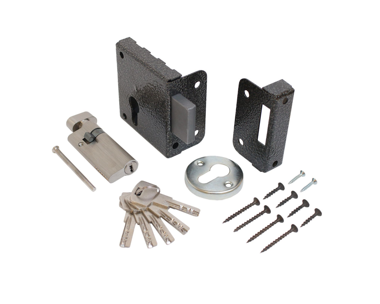 Замок накладной с усиленным цинковым цилиндровым механизмом. Предназначен для установки на деревянные и легкие металлические двери, Подходит для тамбурных дверей, т.к. вертушка не имеет фиксированных положений. Комплектация - 5 перфорированных ключей, запорная планка, накладка. Закрывание и открывание замка изнутри - вертушкой, снаружи - ключом.