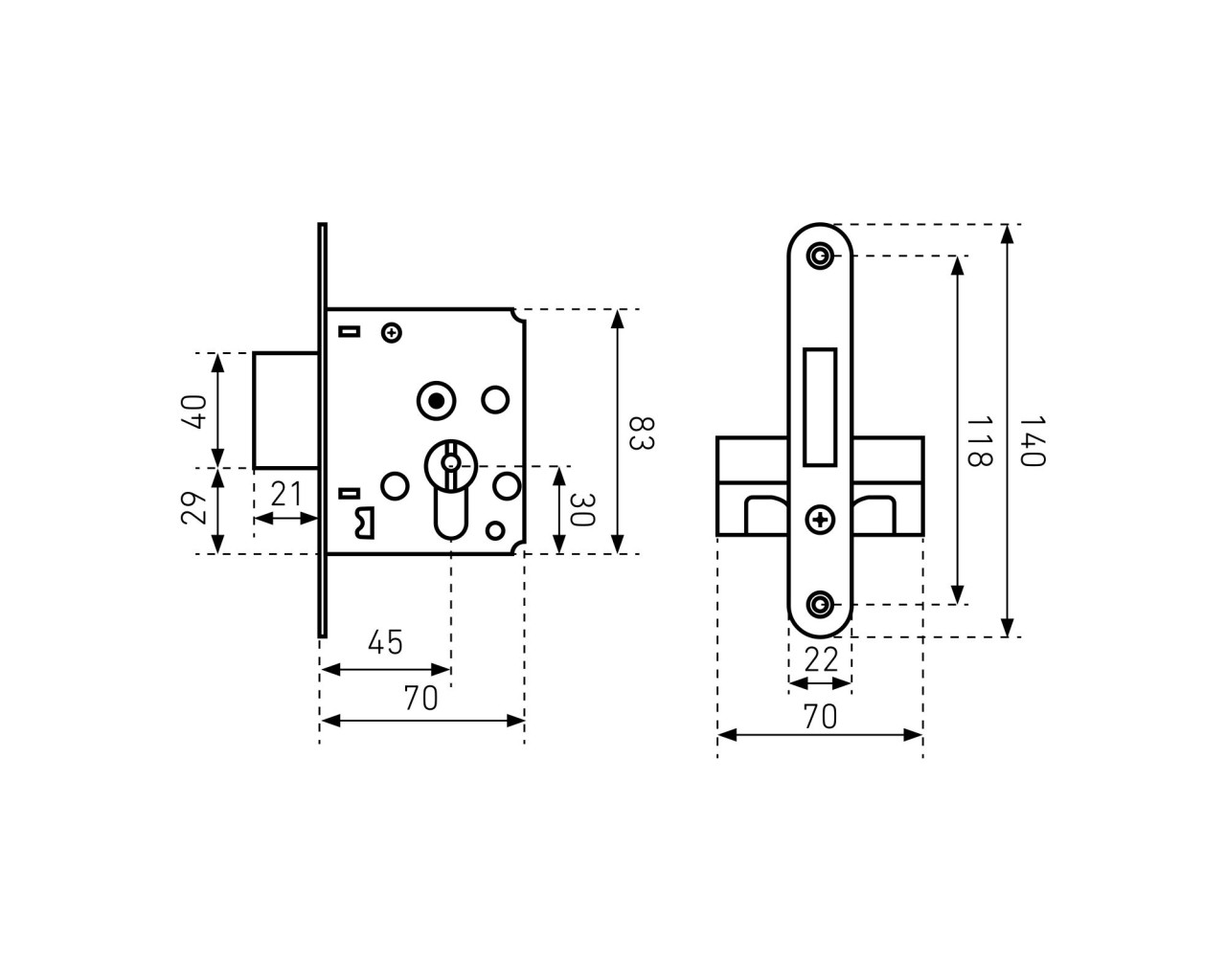 Замок врезной цилиндровый. Предназначен для установки в деревянные двери до 50мм. Стальной оцинкованный корпус. Прямоугольный ригель, вылет 22мм. Удаление ключевого отверстия 45мм. Габаритный размер 80 х70 х13 мм. Комплектуется цилиндровым механизмом 70мм с 4 ключами, запорной планкой, комплектом накладок и комплектом для крепежа.