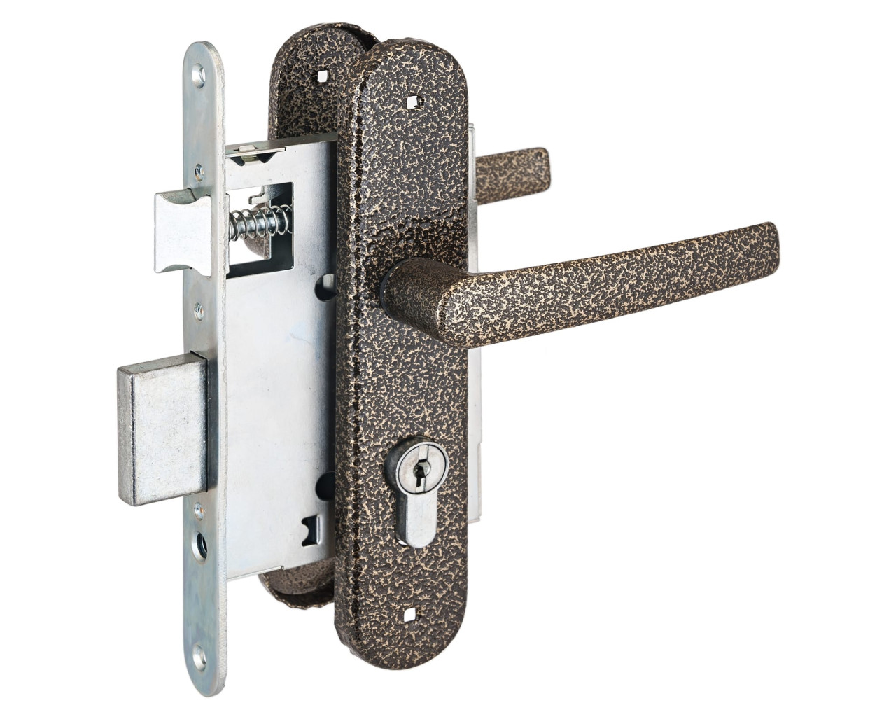 Замок врезной с ручками, цилиндровый. Предназначен для установки в деревянные двери толщиной 40-50мм, правого и левого открывания. Стальной оцинкованный корпус. Прямоугольный ригель из цинкового сплава, вылет 22мм. Межосевое расстояние 55мм. Удаление ключевого отверстия 55мм. Габаритный размер 85х130 мм. Ручки - сталь, алюминиевый сплав, покрытие - краска, крепление - стяжками. Комплектуется цилиндровым механизмом 70мм с 4 ключами. 15000 секретных комбинаций.