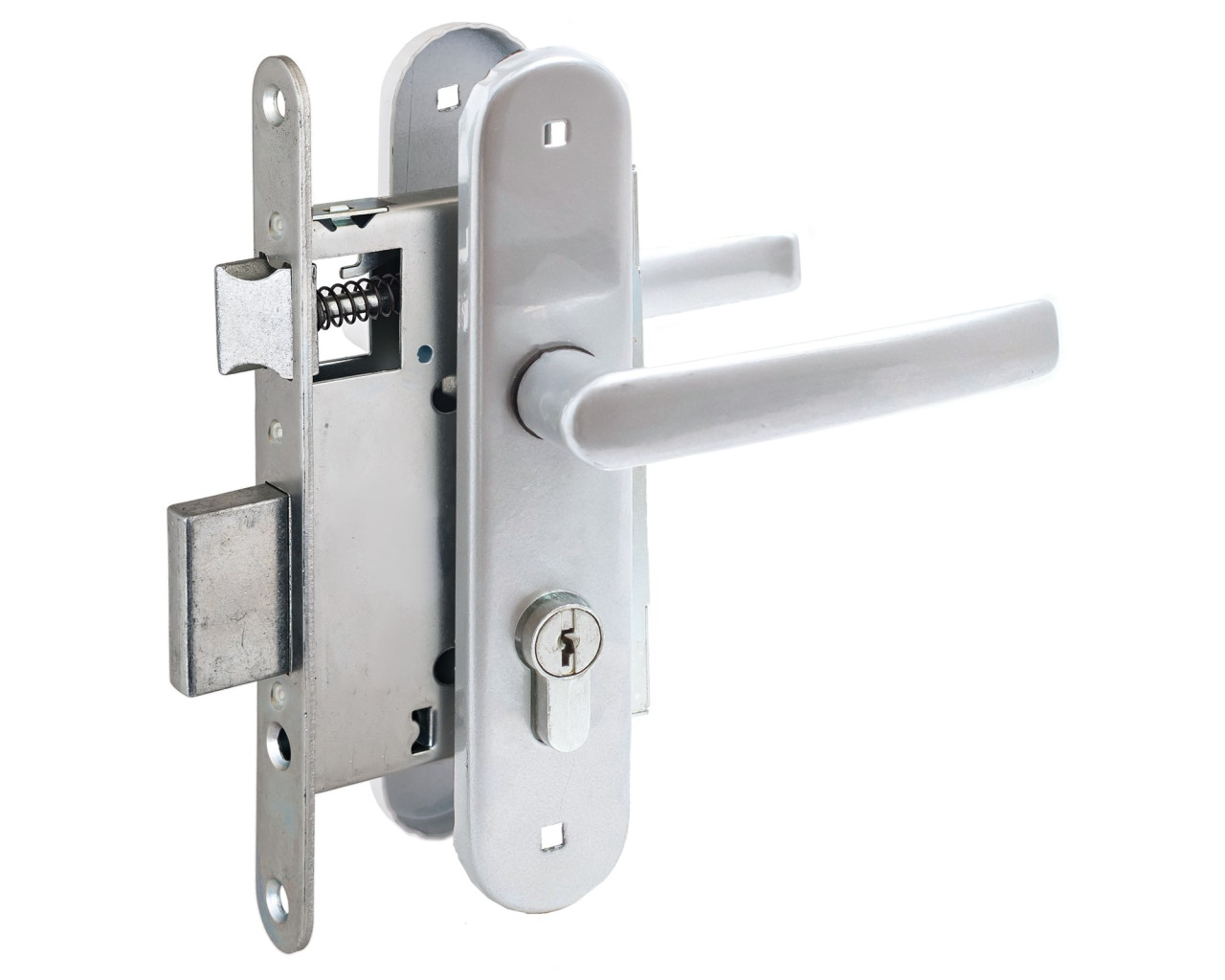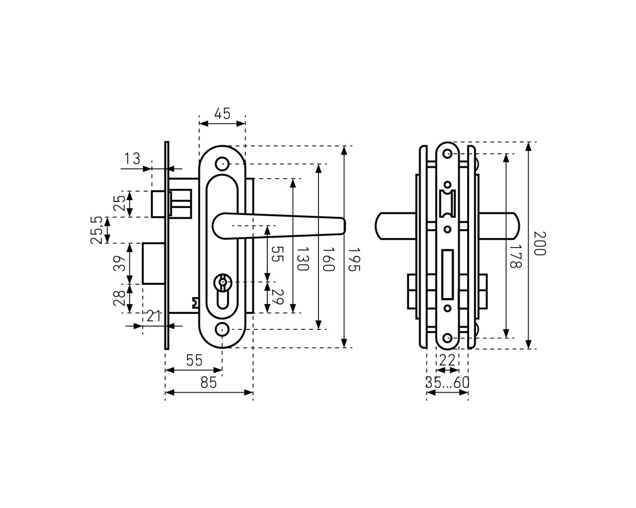 Замок врезной с ручками, цилиндровый. Предназначен для установки в деревянные двери толщиной 40-50мм, правого и левого открывания. Стальной оцинкованный корпус. Прямоугольный ригель из цинкового сплава, вылет 22мм. Межосевое расстояние 55мм. Удаление ключевого отверстия 55мм. Габаритный размер 85х130 мм. Ручки - сталь, алюминиевый сплав, покрытие - краска, крепление - стяжками. Комплектуется цилиндровым механизмом 70мм с 4 ключами. 15000 секретных комбинаций.