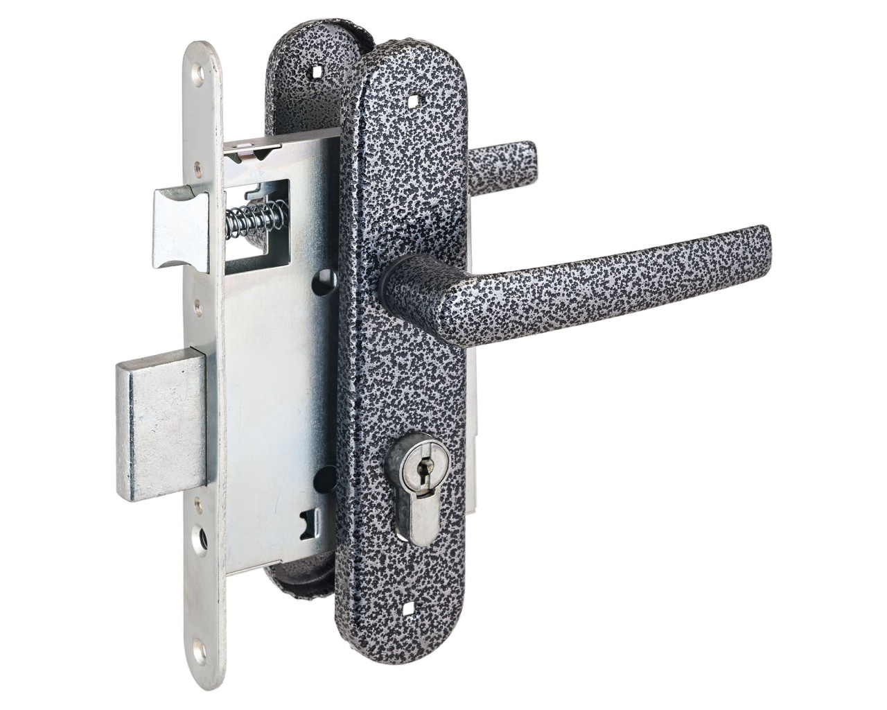 Замок врезной с ручками, цилиндровый. Предназначен для установки в деревянные двери толщиной 40-50мм, правого и левого открывания. Стальной оцинкованный корпус. Прямоугольный ригель из цинкового сплава, вылет 22мм. Межосевое расстояние 55мм. Удаление ключевого отверстия 55мм. Габаритный размер 85х130 мм. Ручки - сталь, алюминиевый сплав, покрытие - краска, крепление - стяжками. Комплектуется цилиндровым механизмом 70мм с 4 ключами. 15000 секретных комбинаций.