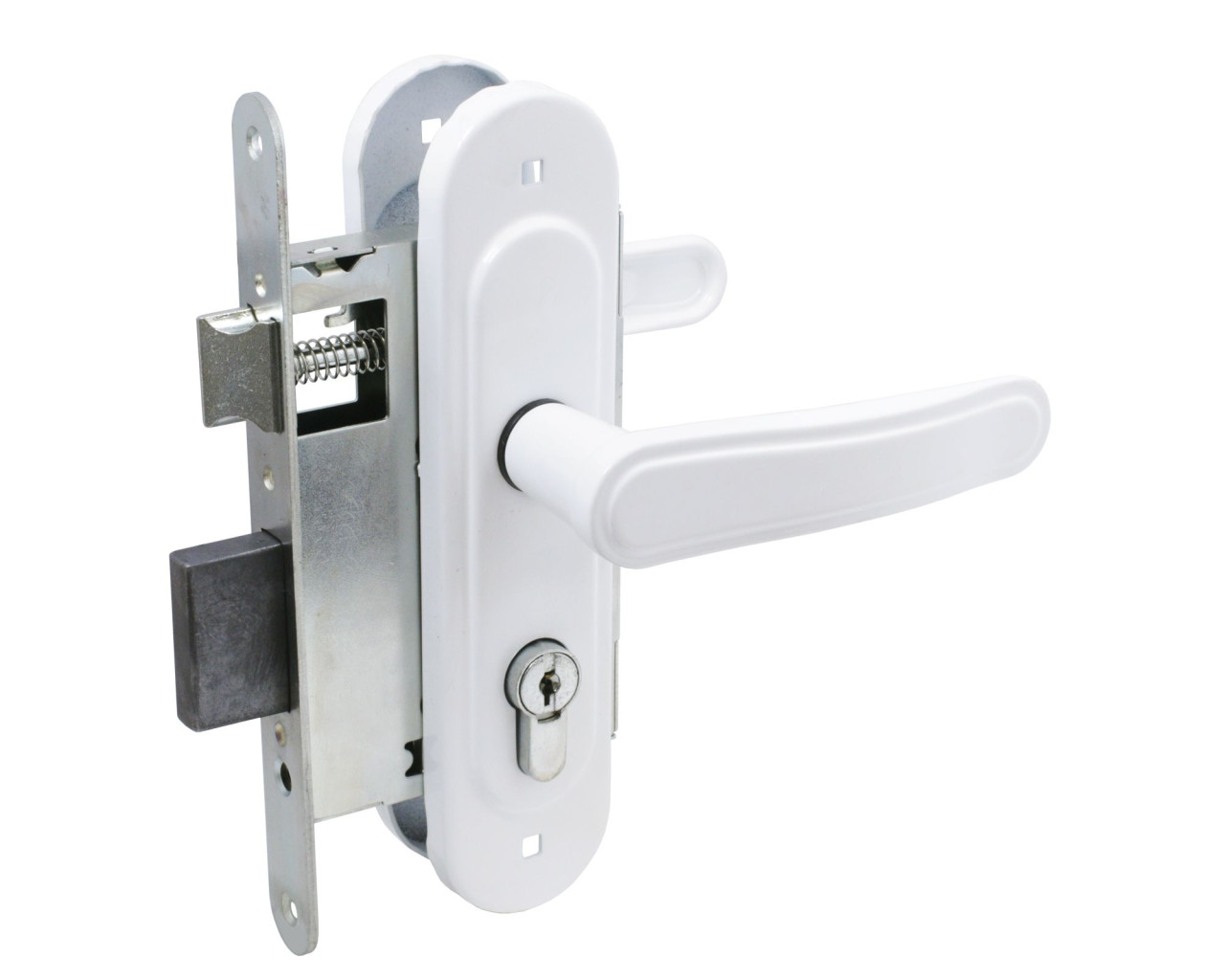 Замок врезной с ручками, цилиндровый. Предназначен для установки в деревянные двери толщиной 40-50мм, правого и левого открывания. Стальной оцинкованный корпус. Прямоугольный ригель из цинкового сплава, вылет 22мм. Межосевое расстояние 55мм. Удаление ключевого отверстия 55мм. Габаритный размер 85х130 мм. Ручки - сталь, алюминиевый сплав, покрытие - краска, крепление - стяжками. Комплектуется цилиндровым механизмом 70мм с 4 ключами. 15000 секретных комбинаций.