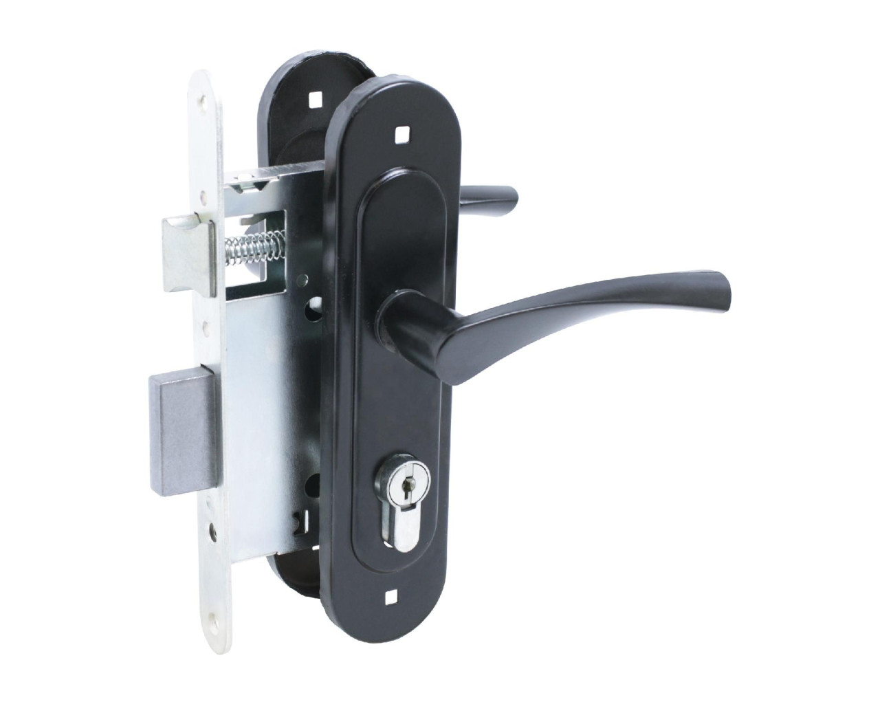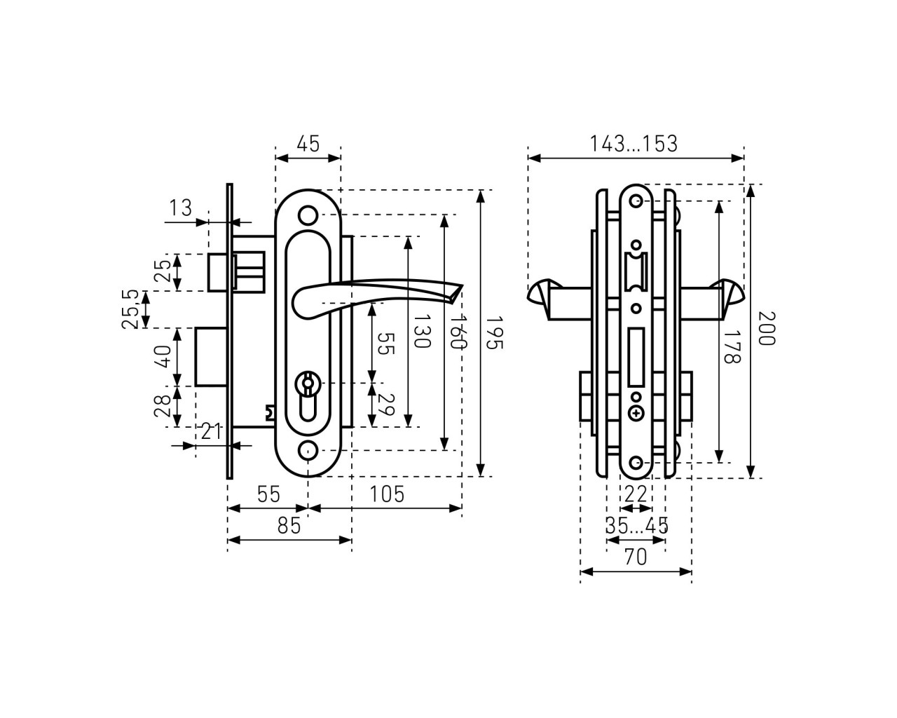 Замок врезной с ручками, цилиндровый. Предназначен для установки в деревянные двери толщиной 40-50мм, правого и левого открывания. Стальной оцинкованный корпус. Прямоугольный ригель из цинкового сплава, вылет 22мм. Межосевое расстояние 55мм. Удаление ключевого отверстия 55мм. Габаритный размер 85х130 мм. Ручки - сталь, алюминиевый сплав, покрытие - краска, крепление - стяжками. Комплектуется цилиндровым механизмом 70мм с 4 ключами. 15000 секретных комбинаций.