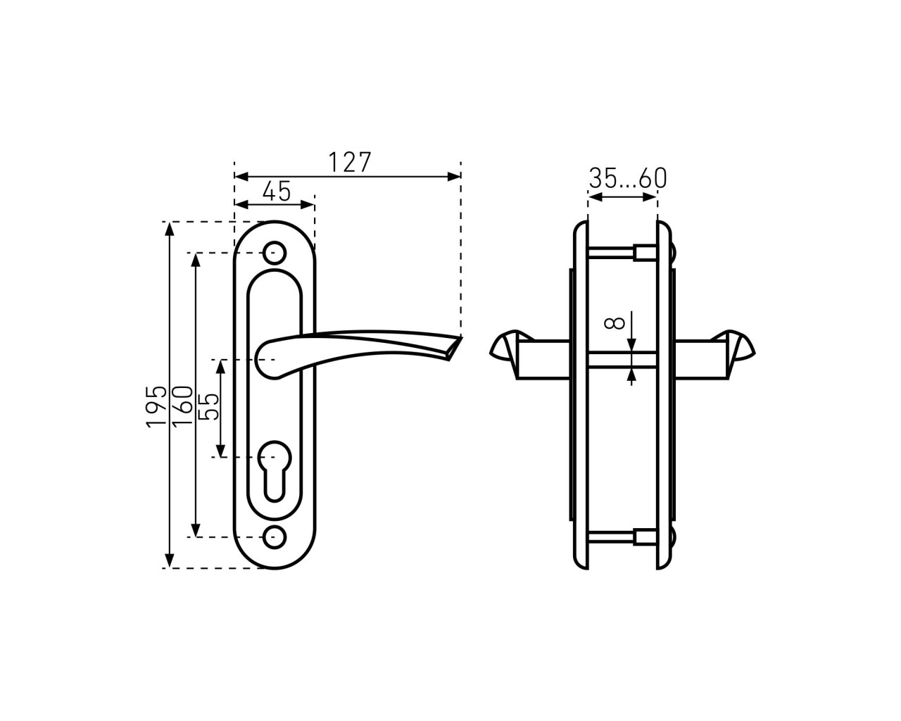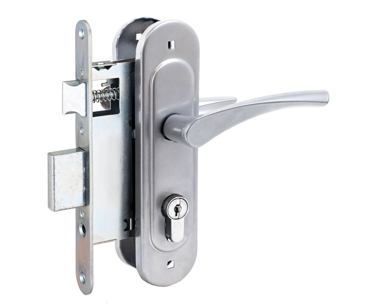 Замок врезной с ручками, цилиндровый. Предназначен для установки в деревянные двери толщиной 40-50мм, правого и левого открывания. Стальной оцинкованный корпус. Прямоугольный ригель из цинкового сплава, вылет 22мм. Межосевое расстояние 55мм. Удаление ключевого отверстия 55мм. Габаритный размер 85х130 мм. Ручки - сталь, алюминиевый сплав, покрытие - краска, крепление - стяжками. Комплектуется цилиндровым механизмом 70мм с 4 ключами. 15000 секретных комбинаций.