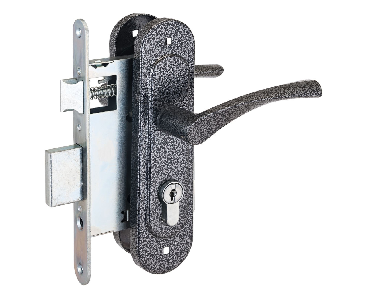 Замок врезной с ручками, цилиндровый. Предназначен для установки в деревянные двери толщиной 40-50мм, правого и левого открывания. Стальной оцинкованный корпус. Прямоугольный ригель из цинкового сплава, вылет 22мм. Межосевое расстояние 55мм. Удаление ключевого отверстия 55мм. Габаритный размер 85х130 мм. Ручки - сталь, алюминиевый сплав, покрытие - краска, крепление - стяжками. Комплектуется цилиндровым механизмом 70мм с 4 ключами. 15000 секретных комбинаций.