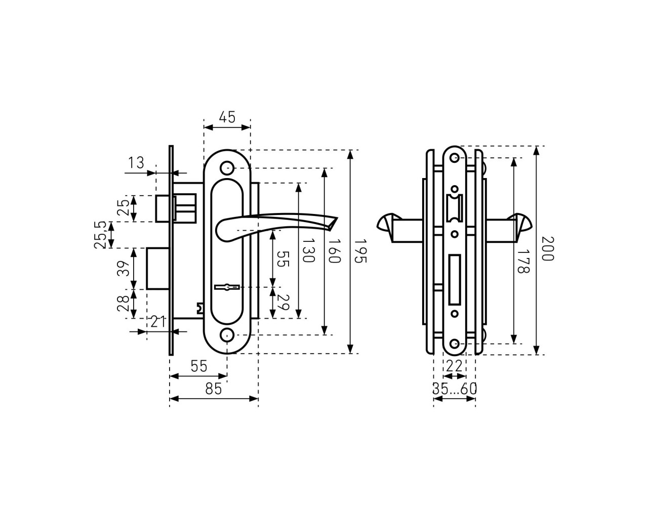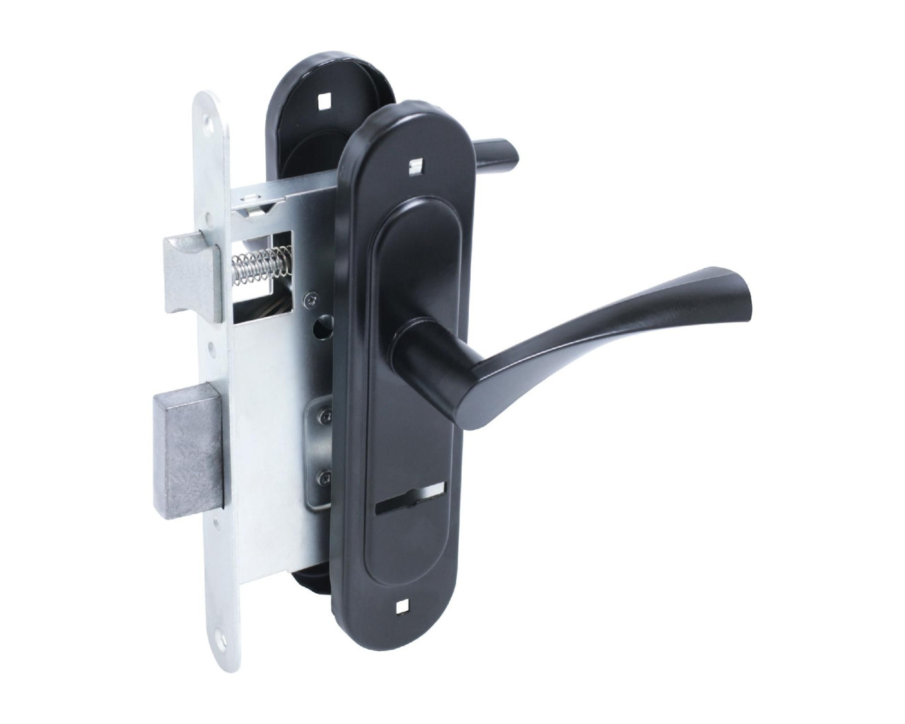 Замок врезной с ручками. Предназначен для установки в деревянные двери толщиной до 65 мм, правого и левого открывания. Стальной оцинкованный корпус, засов с вылетом 22мм. Межосевое расстояние 55мм. Удаление ключевого отверстия 55мм. Габаритный размер 130х85 мм. Ручки - сталь, алюминиевый сплав, покрытие - полимерная краска, крепление - стяжками. Сувальдный механизм запирания, 3 ключа в комплекте.