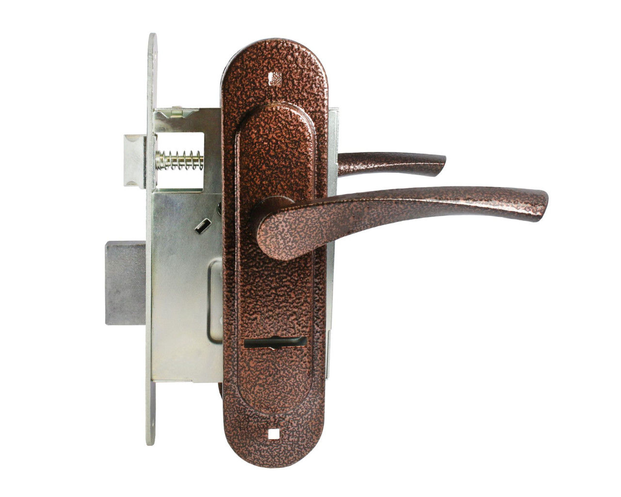 Замок врезной с ручками. Предназначен для установки в деревянные двери толщиной до 65 мм, правого и левого открывания. Стальной оцинкованный корпус, засов с вылетом 22мм. Межосевое расстояние 55мм. Удаление ключевого отверстия 55мм. Габаритный размер 130х85 мм. Ручки - сталь, алюминиевый сплав, покрытие - полимерная краска, крепление - стяжками. Сувальдный механизм запирания, 3 ключа в комплекте.