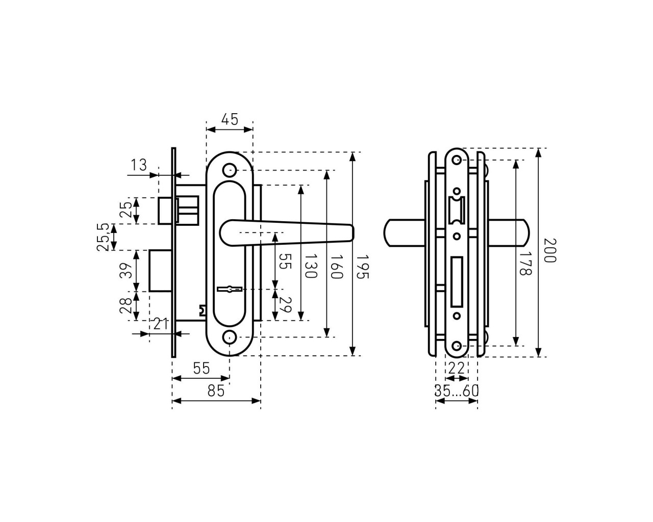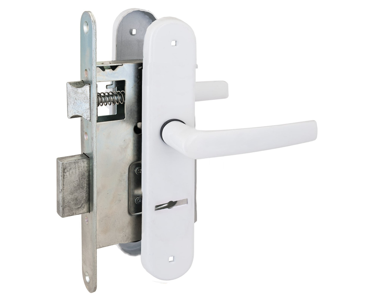 Замок врезной с ручками. Предназначен для установки в деревянные двери толщиной до 65 мм, правого и левого открывания. Стальной оцинкованный корпус, засов с вылетом 22мм. Межосевое расстояние 55мм. Удаление ключевого отверстия 55мм. Габаритный размер 130х85 мм. Ручки - сталь, алюминиевый сплав, покрытие - полимерная краска, крепление - стяжками. Сувальдный механизм запирания, 3 ключа в комплекте.