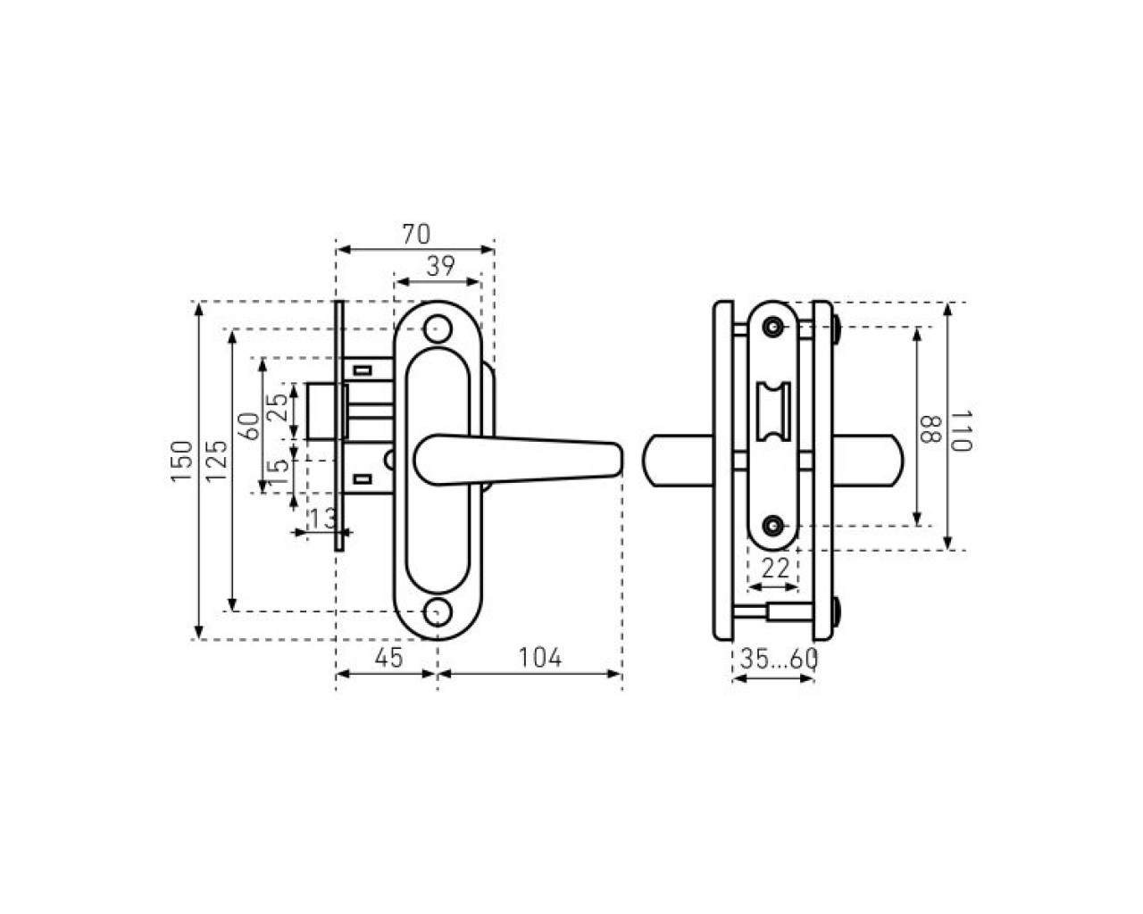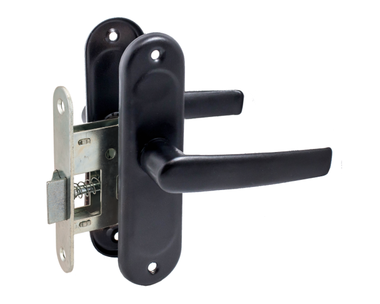 Защёлка с фалевыми ручками для установки на деревянные межкомнатные двери. Материал корпуса - сталь оцинкованная, материал защелки - цинковый сплав, ручек - алюминиевый сплав, сталь. Габариты корпуса - 70х60мм. Длина планки ручек - 150 мм, расстояние между крепежными отверстиями -125мм.