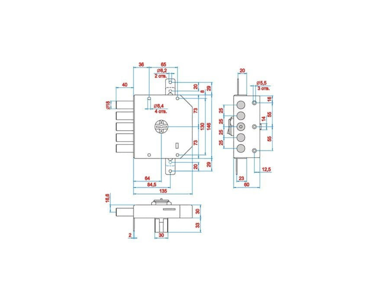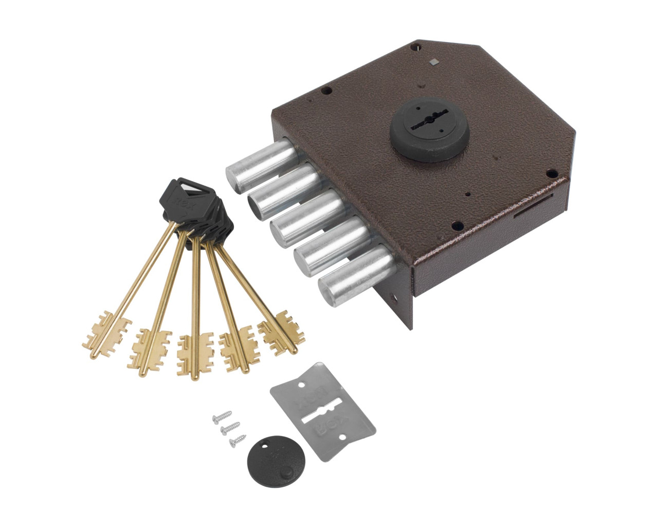 Замок накладной сувальдный. Предназначен для установки на металлические двери. Засов из пяти цилиндрических ригелей диаметром 18 мм, с максимальным вылетом 40 мм. Удаление ключевого отверстия - 64 мм. Количество оборотов ключа - 4. Габариты замка - 135х146х30 мм