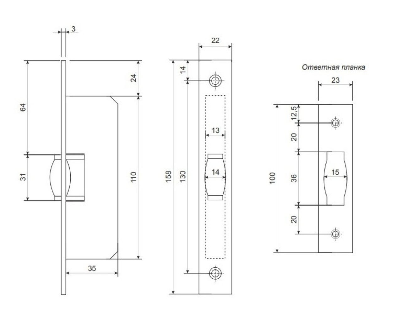 Фиксатор роликовый дверной врезной. Предназначена для запирания межкомнатных дверей (алюминиевых, деревянных, из МДФ и ПВХ). Защелка не запирает, а защелкивает полотно, тем самым удерживая его в дверном проеме. Габариты торцевой планки - 158х22 мм, размер ролика - 31х14 мм. Материал - сталь с гальваническим покрытием.