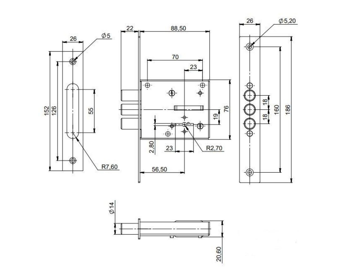 Предназначен для установки на двери толщиной 40 - 50 мм. Замок устанавливается без переналадки на правые и левые двери Максимальные вылет засова 22 мм. Диаметр стальных засовов 14 мм. Общая площадь поперечного сечения засова – 416,7 кв.мм. Габариты замка – 88,5*76*20,6 Количество ключей 3 шт