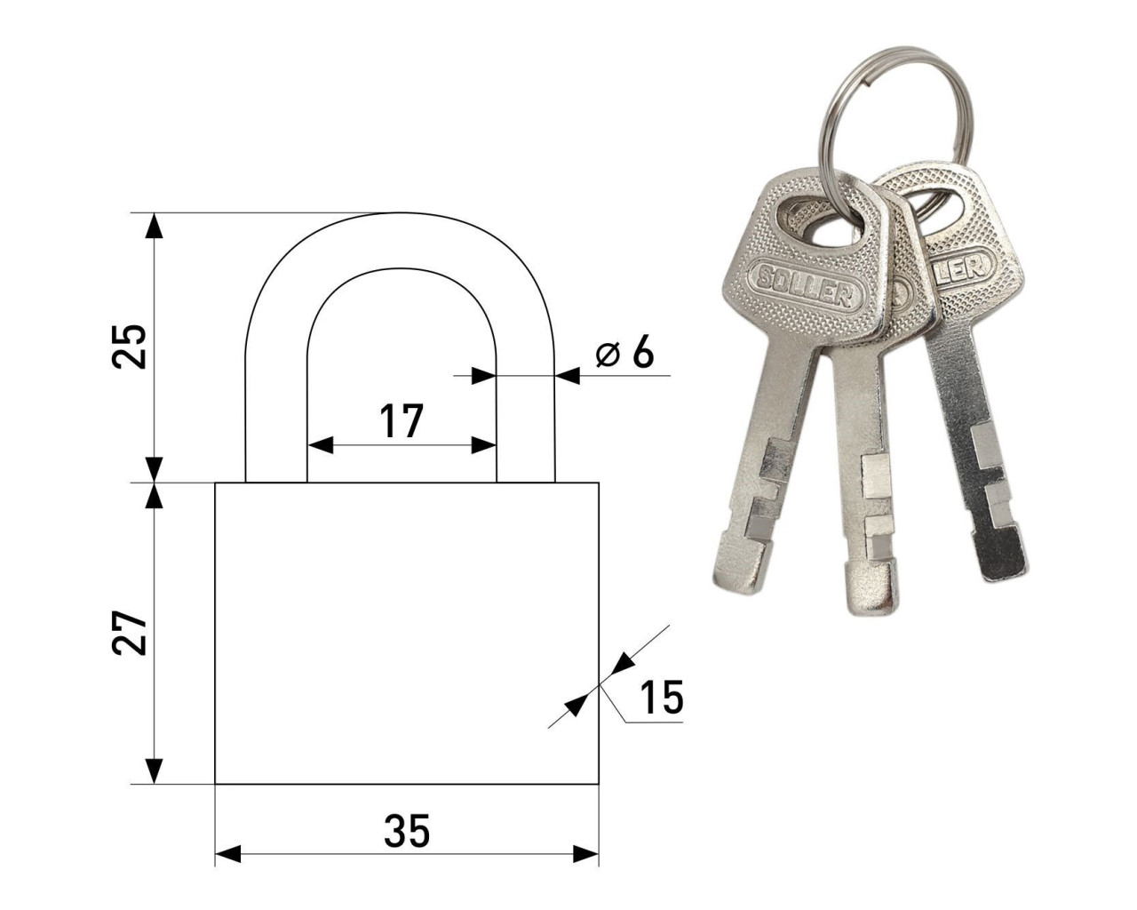 Замок навесной общего применения. Оптимальное соотношение цены и качества. Материал корпуса сталь, цвет сатин. Материал дужки закаленная сталь, гальваническое покрытие. Автоматического запирания нет. Комплектуется 3 дисковыми ключами. Ширина корпуса - 35 мм. Ширина проема под дужкой - 17 мм. Толщина дужки 6 мм.