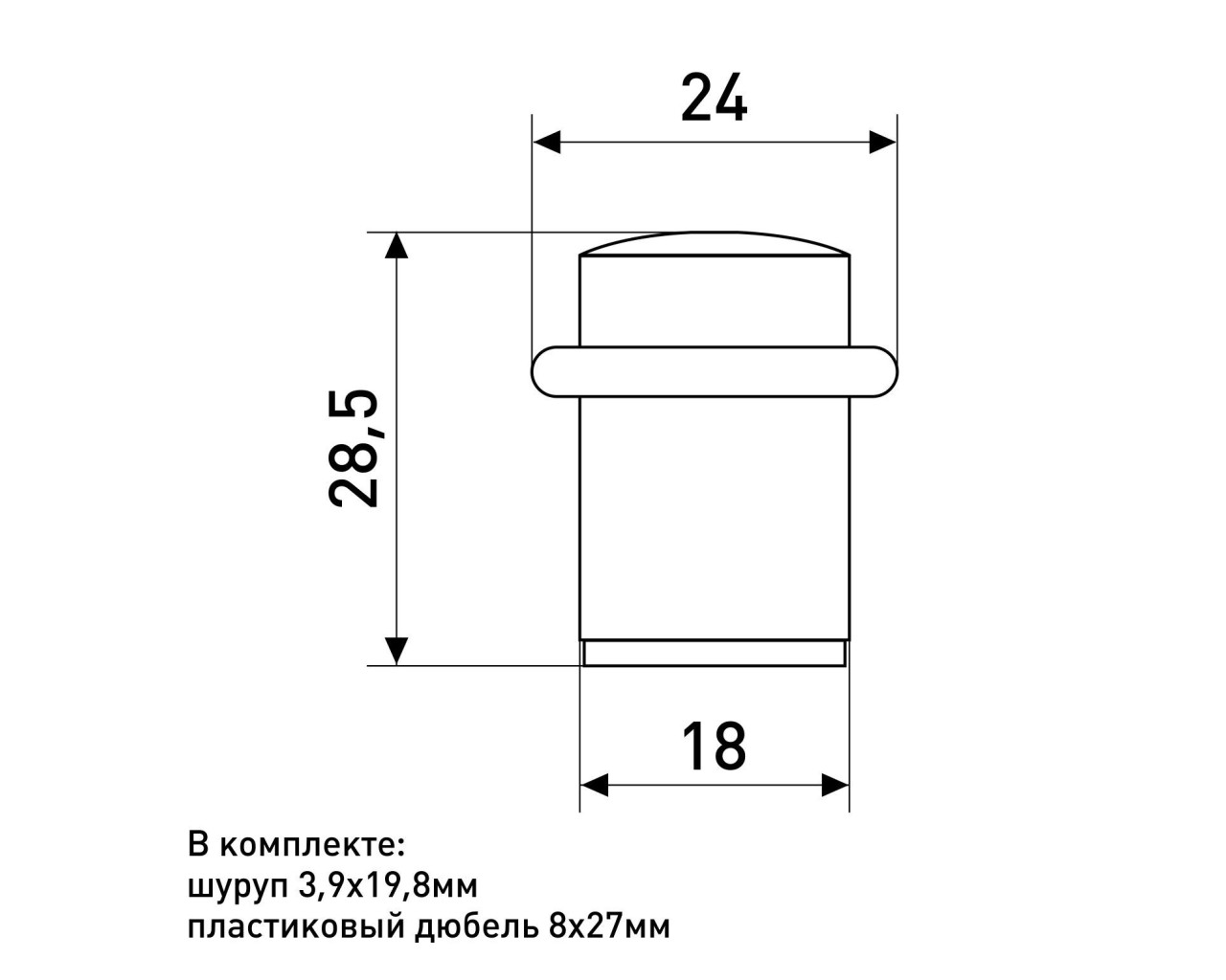 Ограничитель/упор дверной напольный. Материал - ЦАМ Диаметр основания - 18 мм, высота - 28,5 мм. Диаметр по резинке- 24 мм. Крепеж в комплекте.