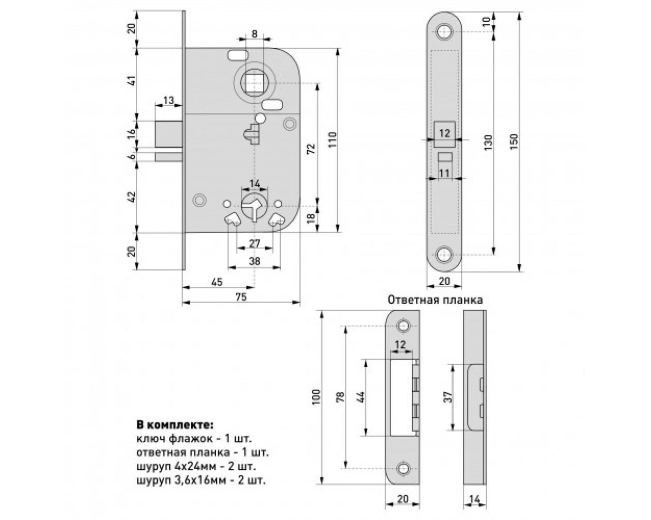Соллер Замок врезной 2014 СР хром 72мм ключ/флажок бруч