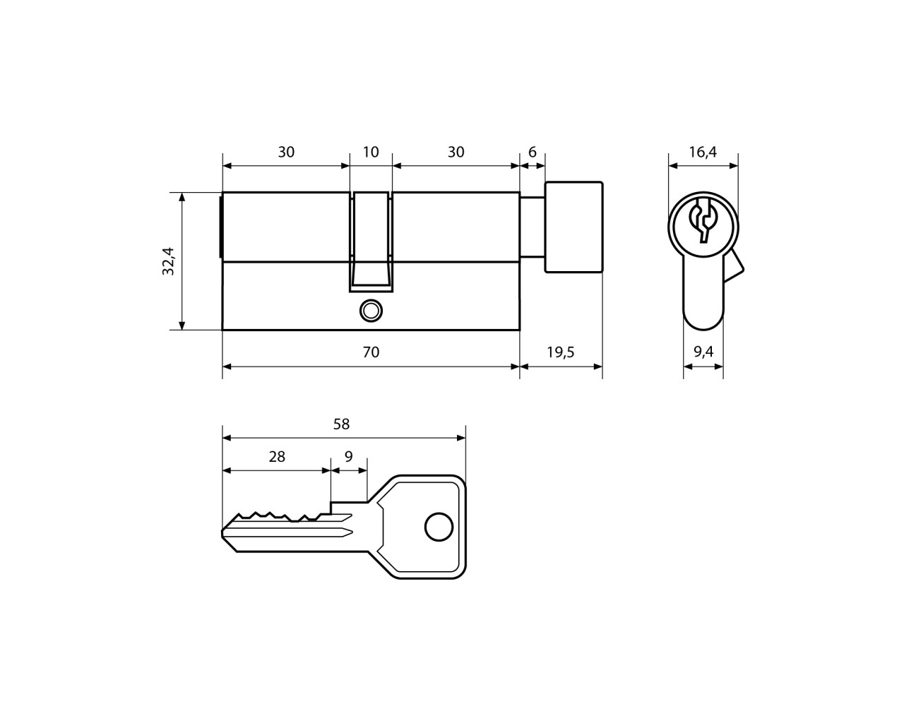 Механизм цилиндровый для врезных замков Европрофиль Английский ключ Материал цилиндра - сталь цинковый сплав Ключ-вертушкаДлина механизма - 70мм