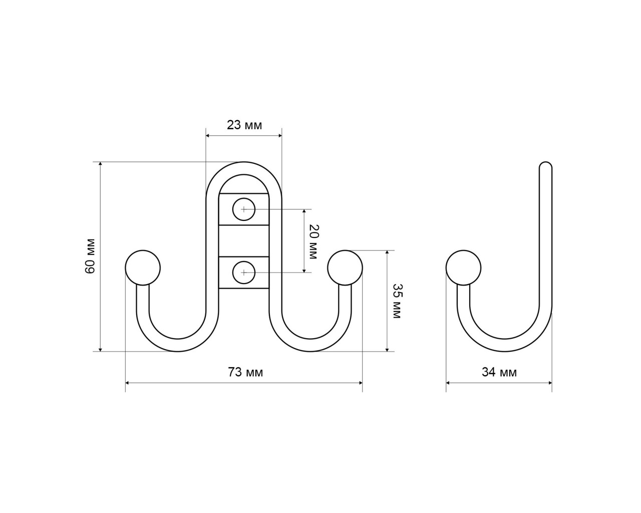 Крючок-вешалка двухрожковый. Материал - цинковый сплав. Крепеж в комплекте.