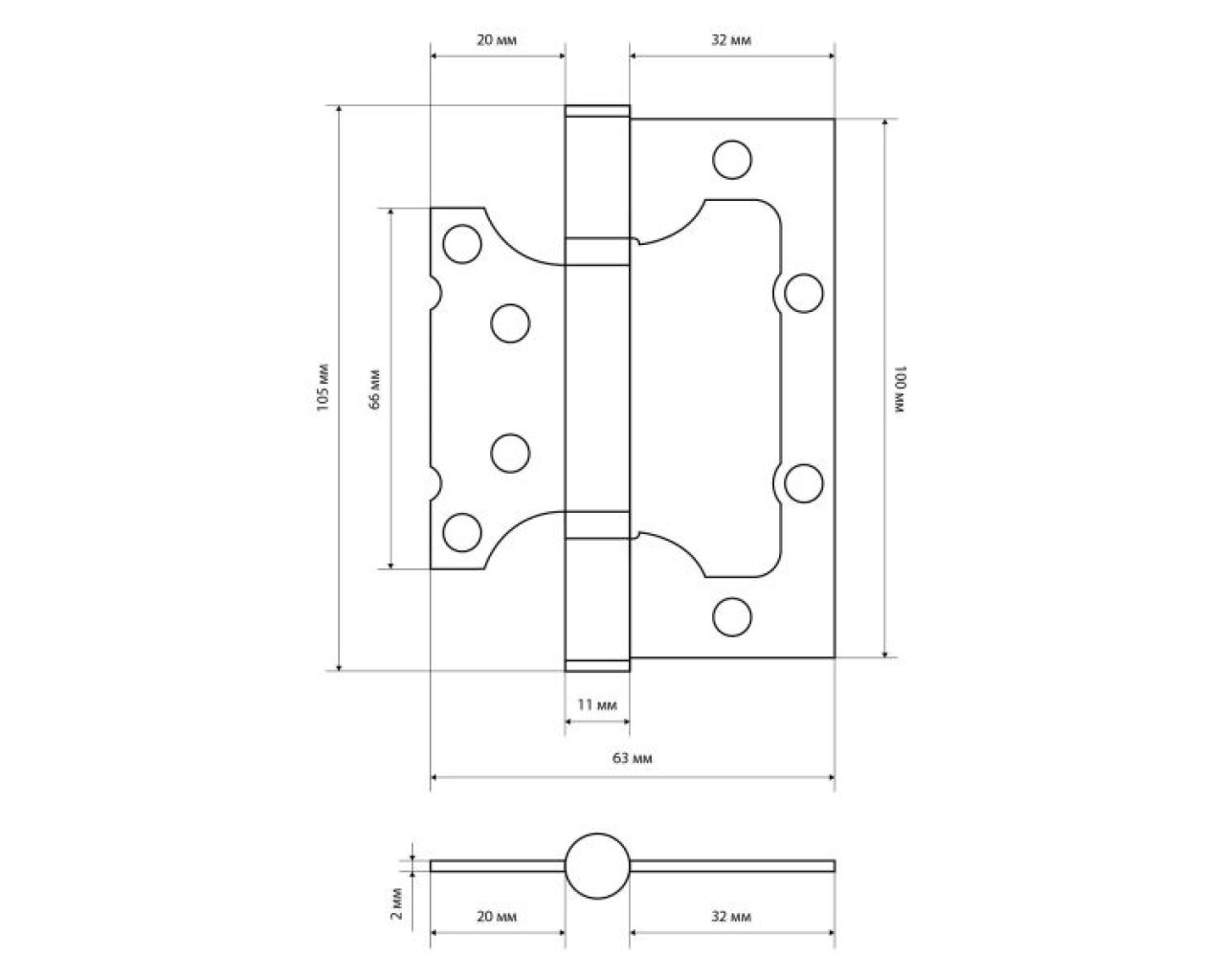 Петля дверная универсальная, без врезки. Предназначена для установки на левые и правые двери. Материал - сталь, гальваническое покрытие. Размер петли - 100х63х2 мм. 2 противоскрипных кольца, плоский колпачок. Упаковка - европакет.