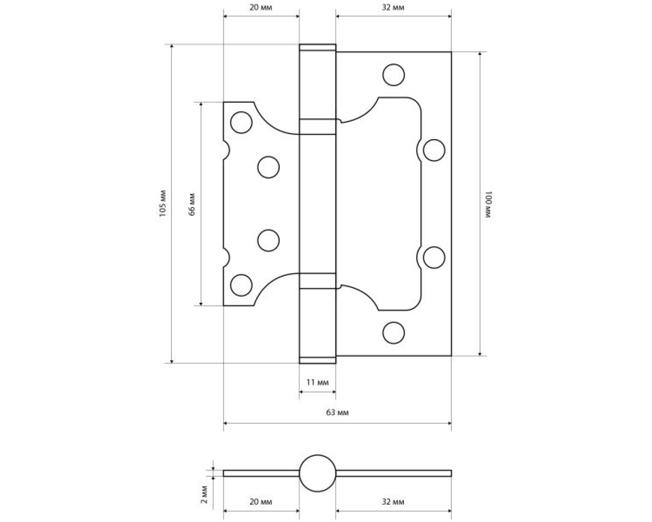 Петля дверная универсальная, без врезки. Предназначена для установки на левые и правые двери. Материал - сталь, гальваническое покрытие. Размер петли - 100х63х2 мм. 2 противоскрипных кольца, плоский колпачок. Упаковка - европакет.