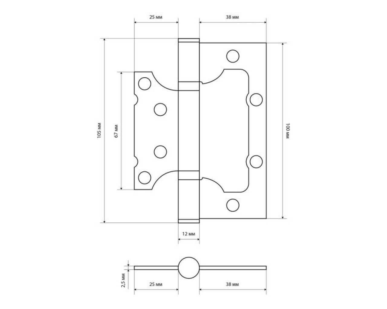 Петля дверная универсальная, без врезки. Предназначена для установки на левые и правые двери. Материал - сталь, гальваническое покрытие. Размер петли - 100х75х2,5 мм. 2 противоскрипных кольца, плоский колпачок.