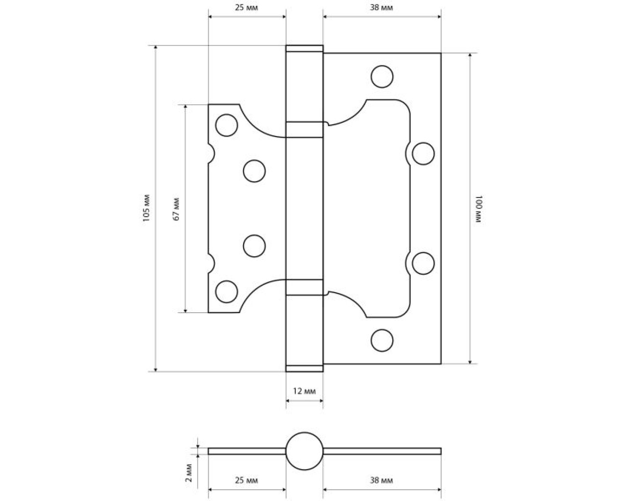 Петля дверная универсальная, без врезки. Предназначена для установки на левые и правые двери. Материал - сталь, гальваническое покрытие. Размер петли - 100х75х2,5 мм. 2 противоскрипных кольца, плоский колпачок.