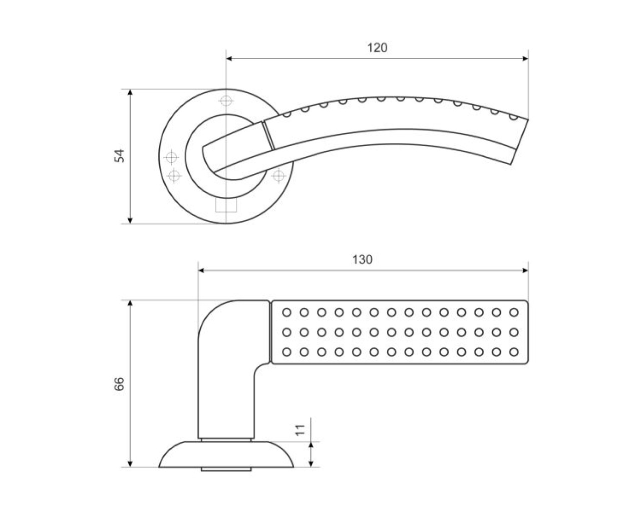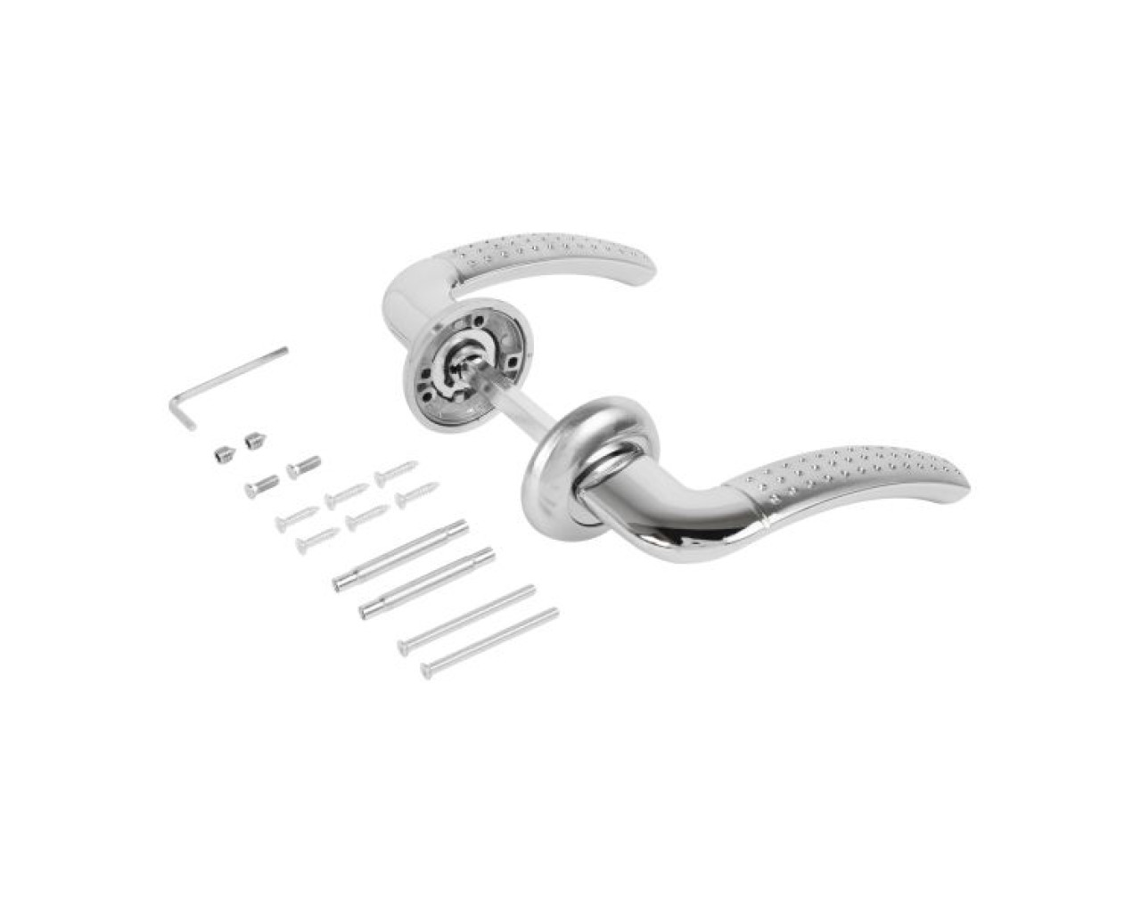 Ручка на круглой накладке. Материал ручек — ABS пластик, сталь, накладки — алюминиевый сплав. Многослойное гальваническое покрытие. Комплектуются винтовыми стяжками и шурупами. Для металлических дверей, толщиной 70-90 мм. Гарантийный срок эксплуатации — 1 год.