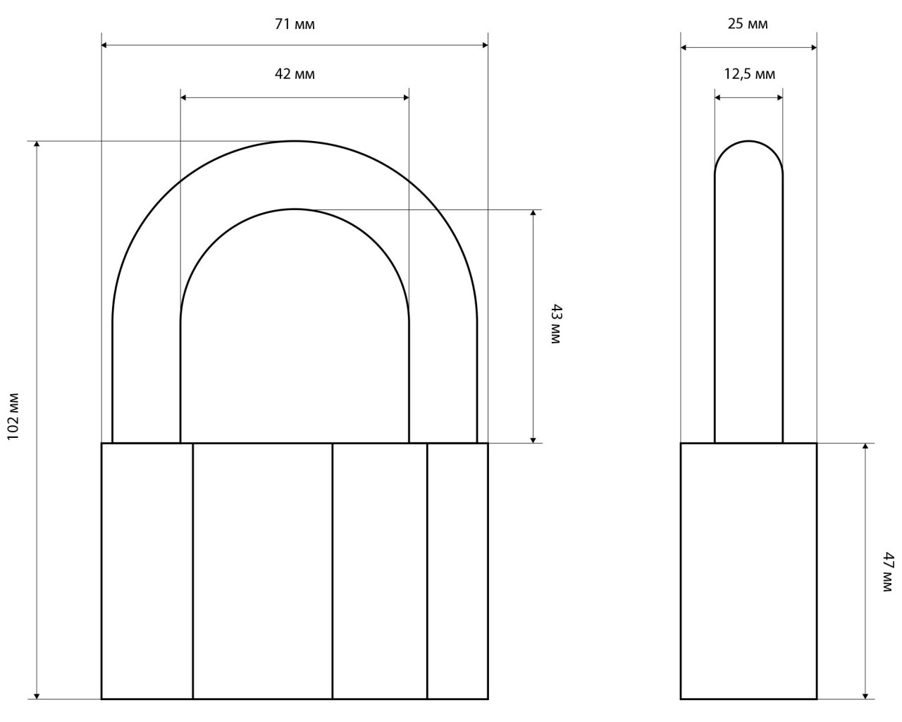 Замок навесной дисковый общего применения. Материал корпуса - алюминиевый сплав. Стальная дужка диаметром 12,5 мм; проем дужки - 43 мм по высоте и 42 мм по ширине. Габариты корпуса - 71х47 мм. Комплектуется 3 ключами.