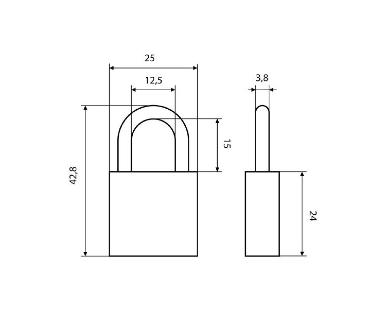 Замок навесной цилиндровый общего применения. Материал корпуса - чугун. Закаленная стальная дужка диаметром 3,8 мм; проем дужки - 15 мм по высоте и 12,5 мм по ширине. Габариты корпуса -25х24 мм. Комплектуется 2 английскими ключами. Замок имеет функцию автоматического закрывания.