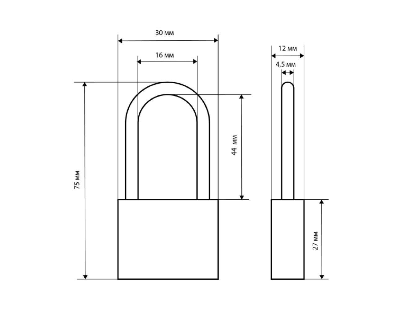 Замок навесной цилиндровый общего применения. Материал корпуса - чугун. Закаленная стальная дужка диаметром 4,5 мм; проем дужки - 44 мм по высоте и 15 мм по ширине. Габариты корпуса - 30х27 мм. Комплектуется 3 английскими ключами. Замок имеет функцию автоматического закрывания.
