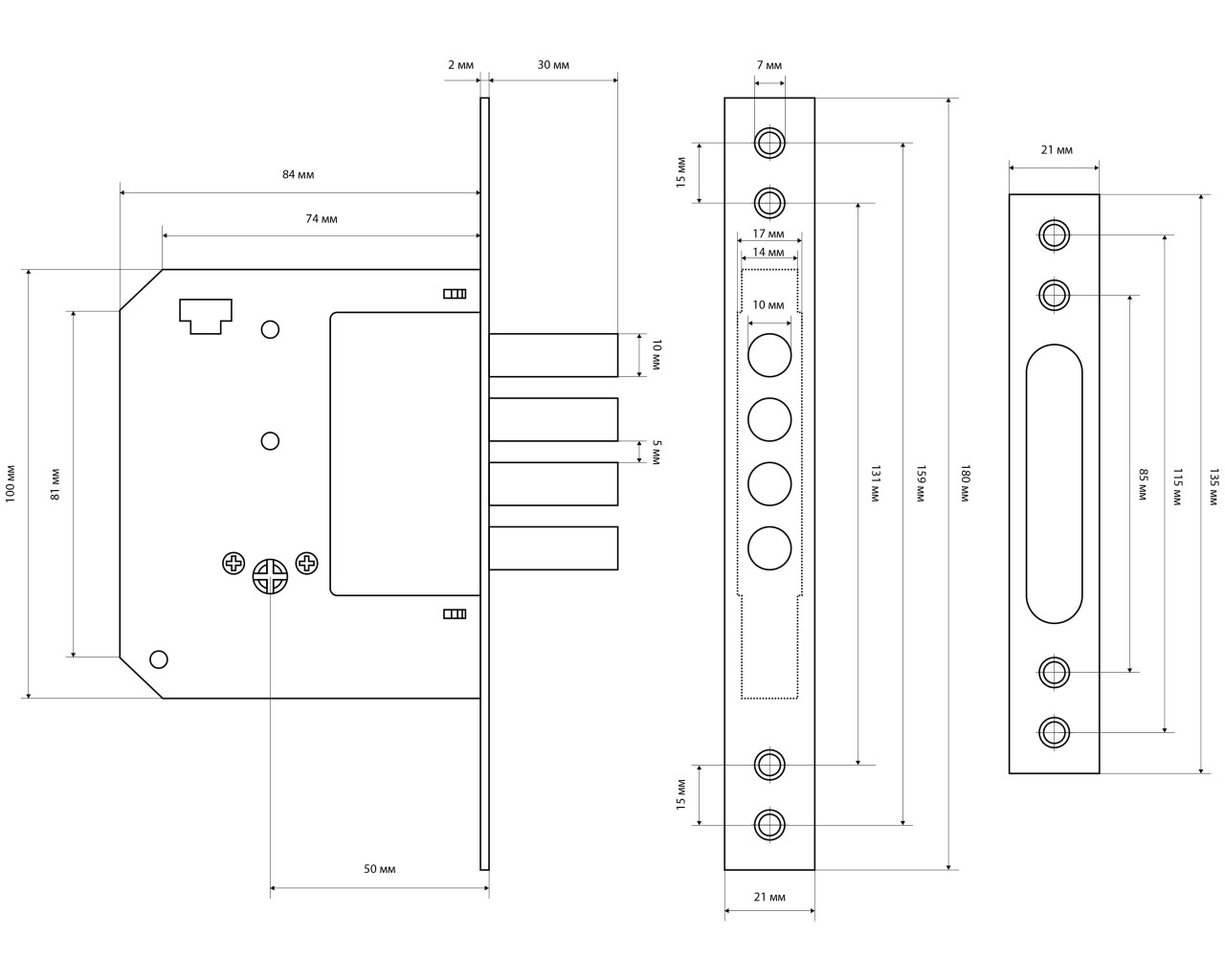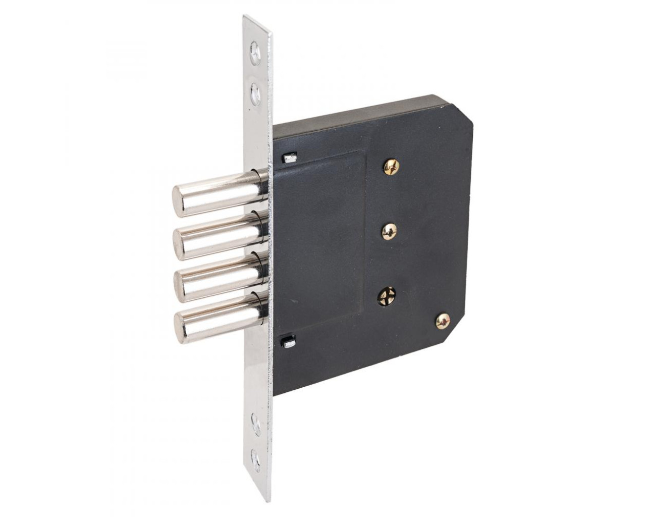 Замок врезной цилиндровый, под крестообразный ключ. Предназначен для установки в деревянные двери, металлические ящики, кабинки и пр. Корпус - стальной покрыт полимерной краской, засов из четырех стальных цилиндрических ригелей, диаметром 12мм. Удаление ключевого отверстия 50мм. 5 ключей. Ширина торцевой планки 23мм, гальваническое покрытие, цвет - хром.