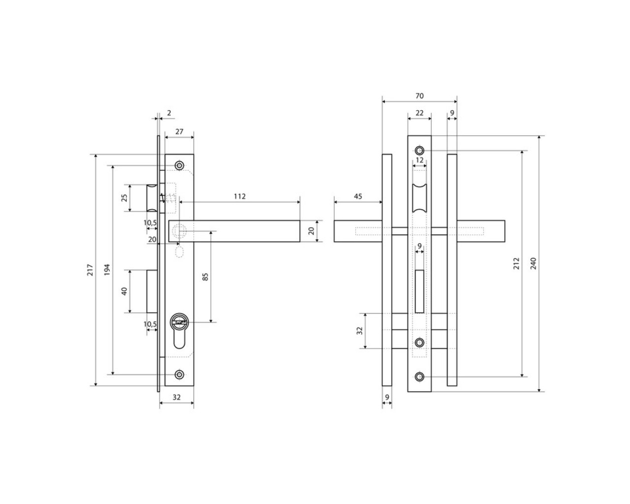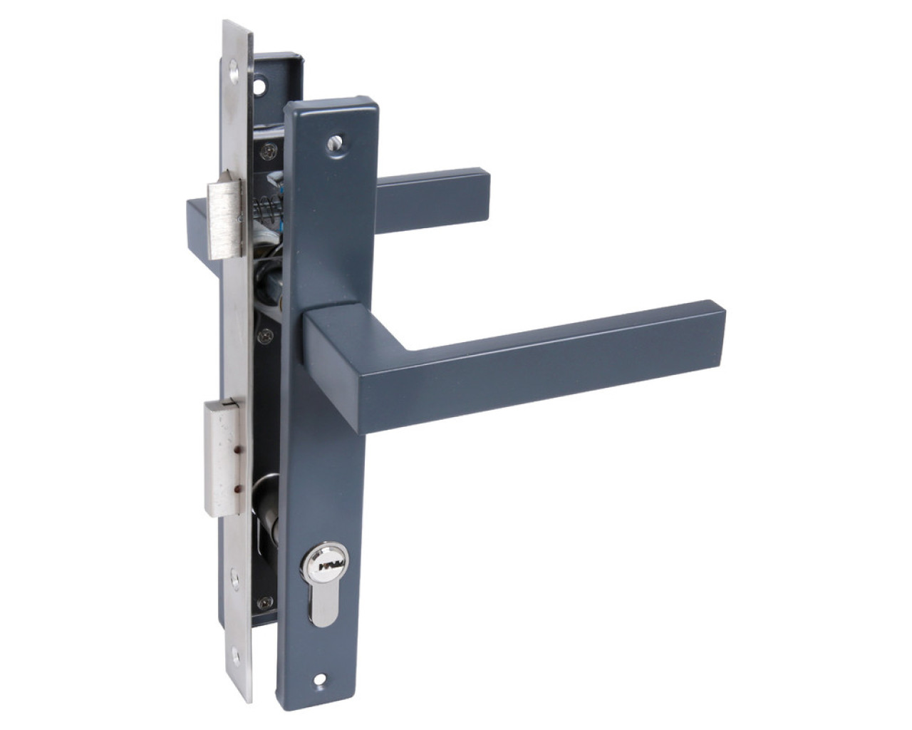 Замок врезной с ручками Предназначен для установки в калиточные двери правого и левого открыванияВозможна установка в деревянные двери а так же двери из алюминиевого профиля Дверь может быть закрыта на защелку и открыта с помощью фалевой ручки при открытом засове замка Универсальная защелка Корпус и торцевая планка из нержавеющей стали Межосевое расстояние 85мм Удаление ключевого отверстия 20мм Ручки с полимерным покрытием по каталогу RAL Материал - сталь Механизм секрета с перфоключом длина 70 мм 5 ключей Материал - цинковый сплав