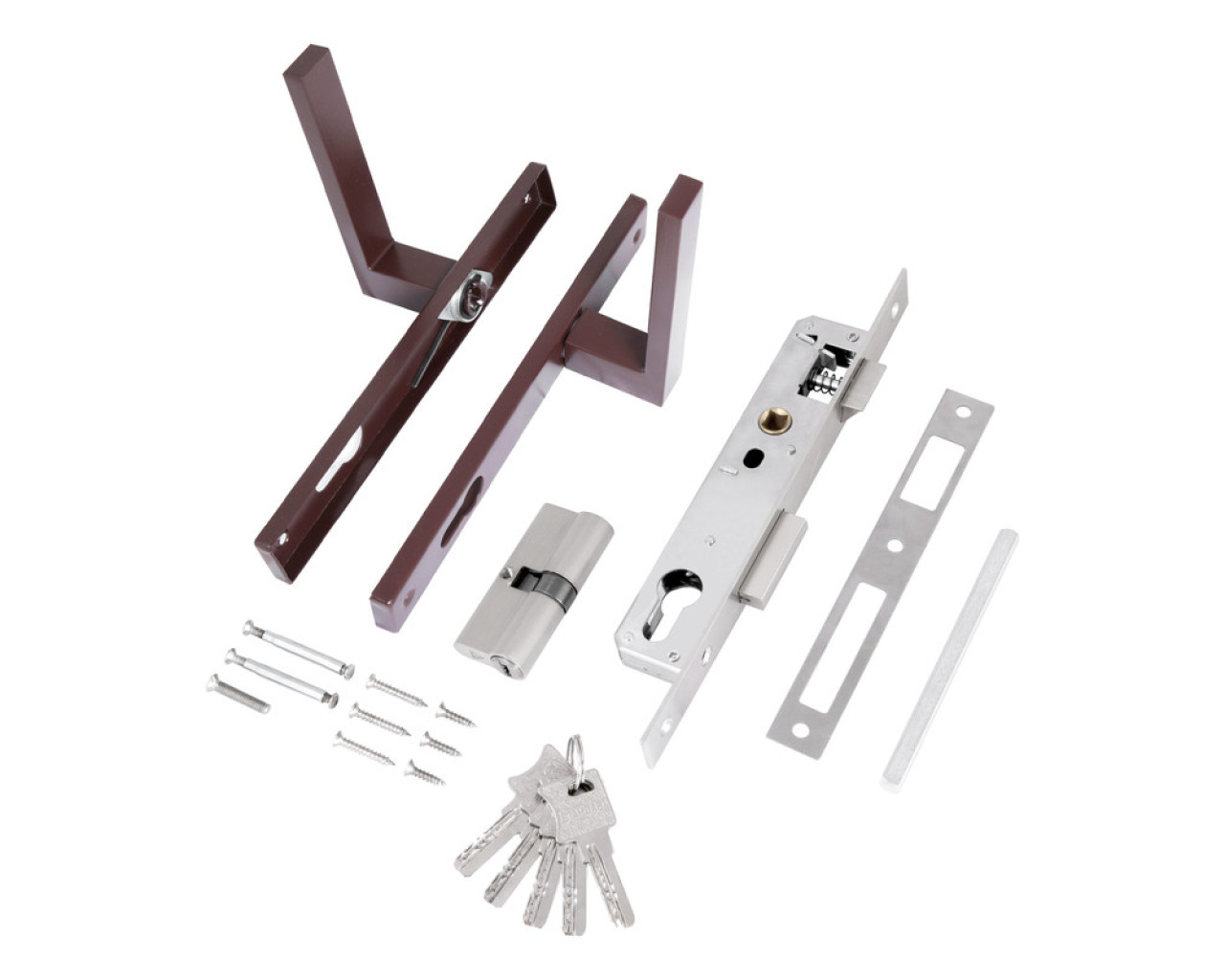 Замок врезной с ручками Предназначен для установки в калиточные двери правого и левого открыванияВозможна установка в деревянные двери а так же двери из алюминиевого профиля Дверь может быть закрыта на защелку и открыта с помощью фалевой ручки при открытом засове замка Универсальная защелка Корпус и торцевая планка из нержавеющей стали Межосевое расстояние 85мм Удаление ключевого отверстия 20мм Ручки с полимерным покрытием по каталогу RAL Материал - сталь Механизм секрета с перфоключом длина 70 мм 5 ключей Материал - цинковый сплав