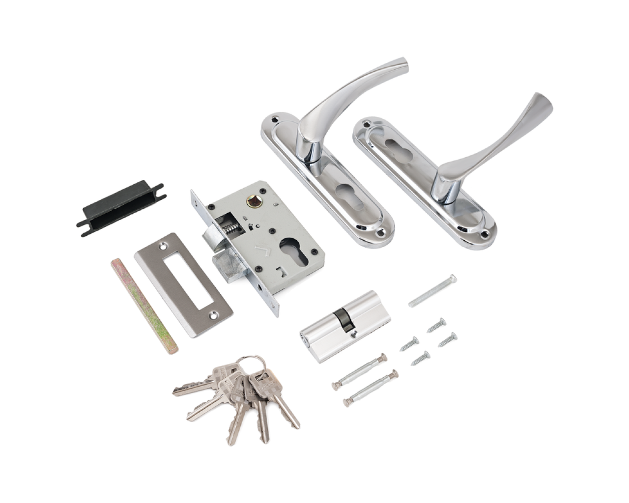 Замок врезной с ручками Предназначен для установки в деревянные двери толщиной до 40мм правого и левого открывания Дверь может быть закрыта на защелку и открыта с помощью фалевой ручки при открытом засове замка Прямоугольный ригель вылет 16мм Универсальная защелка Стальной корпус покрытие эмаль Межосевое расстояние 50мм Удаление ключевого отверстия 40мм Гальваническое покрытие ручек материал алюминий Механизм секрета с уменьшеной высотой профиля длина цм 68 мм кк 5 ключей