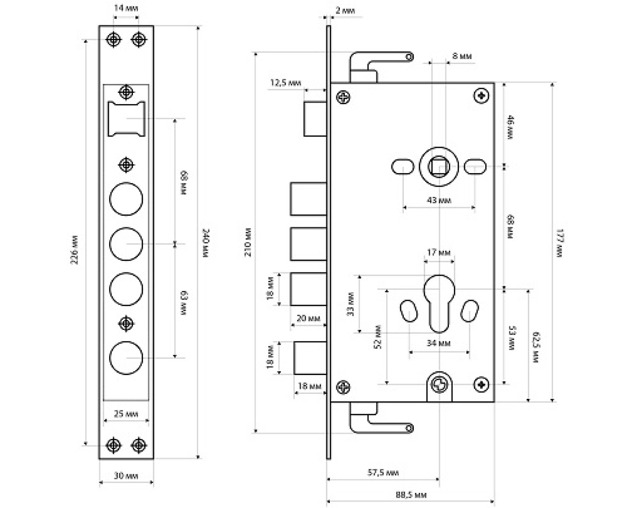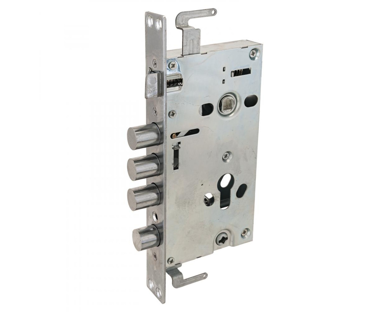 Замок врезной цилиндровый с защелкой и задвижкой, без механизма секрета. Предназначен для установки в китайские металлические двери, в качестве основного замка. Реверсивная защелка позволяет устанавливать замок на правые и левые двери. Три цилиндрических стальных ригеля. 3 точки запирания. Корпус замка - сталь, толщиной 0,9мм. Удаление ключевого отверстия 60мм. Межосевое расстояние 68мм. Расстояние от центра механизма секрета до задвижки 53мм. Ширина корпуса 88,5мм позволяет устанавливать изделие в двери с широким и узким "карманом" для замка.Цвет торцевой планки - хром, ширина 30мм
