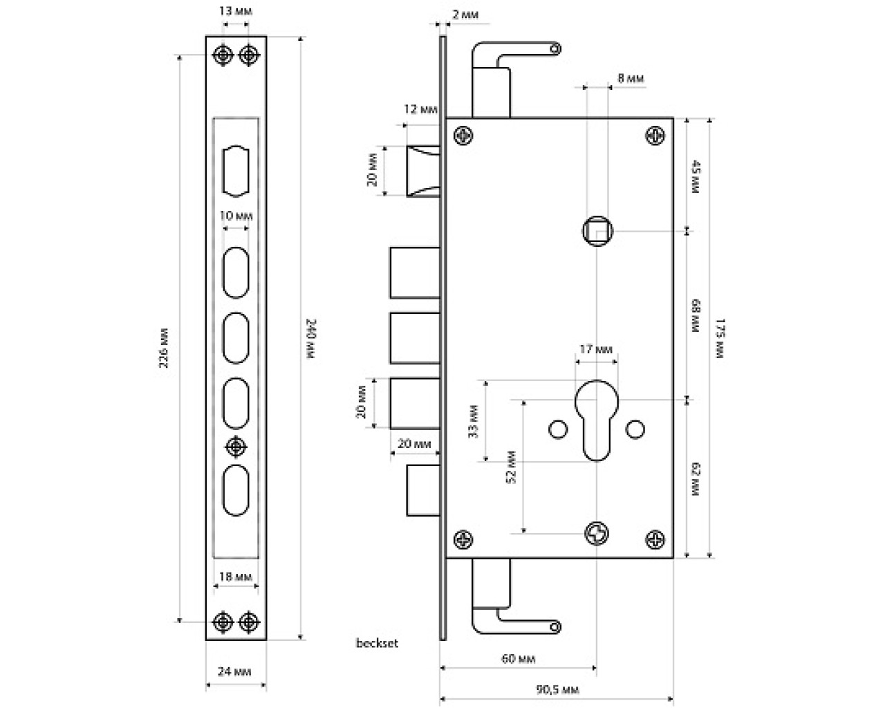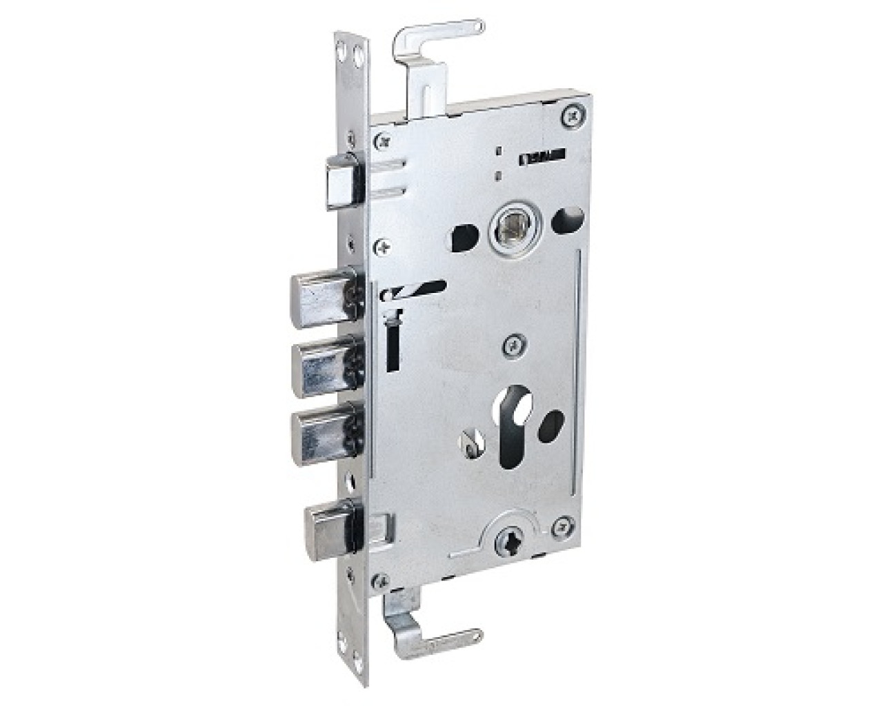 Замок врезной цилиндровый с защелкой и задвижкой, без механизма секрета. Предназначен для установки в китайские металлические двери, в качестве основного замка. Реверсивная защелка позволяет устанавливать замок на правые и левые двери. Три прямоугольных стальных ригеля. Вылет ригелей 20мм. 3 точки запирания. Корпус замка - сталь, толщиной 0,9мм. Удаление ключевого отверстия 60мм. Межосевое расстояние 68мм. Расстояние от центра механизма секрета до задвижки 52мм. Цвет торцевой планки - хром, ширина 24мм