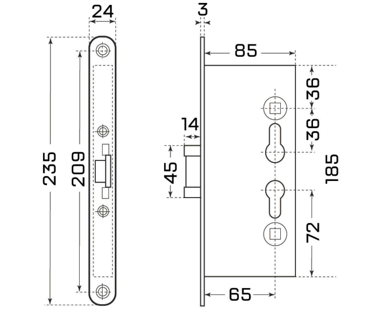 Замок врезной цилиндровый с защелкой, без механизма секрета. Предназначен для установки на технические двери. Замок имеет два прямоугольных ригеля размерами 6х8 мм, с максимальным вылетом 14 мм, и защелку размерами 27х13 мм. Удаление ключевого отверстия - 65. Межосевое расстояние 72 мм. Габариты замка - 80х185х17 мм.Комплектуется винтами для крепления замка и винтом 80 мм для цилиндрового механизма. 1 год гарантии