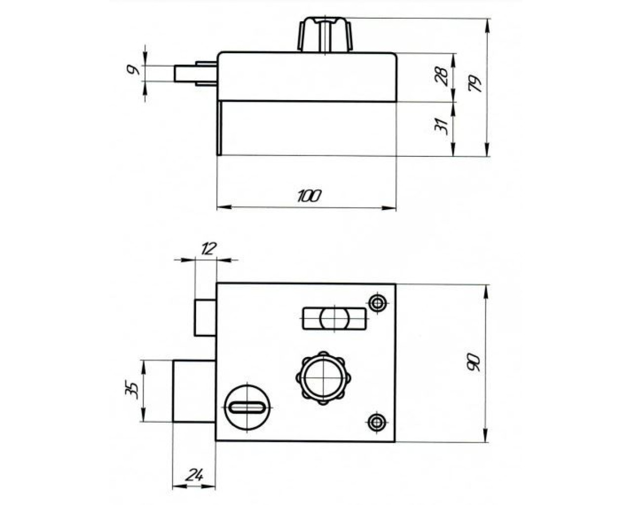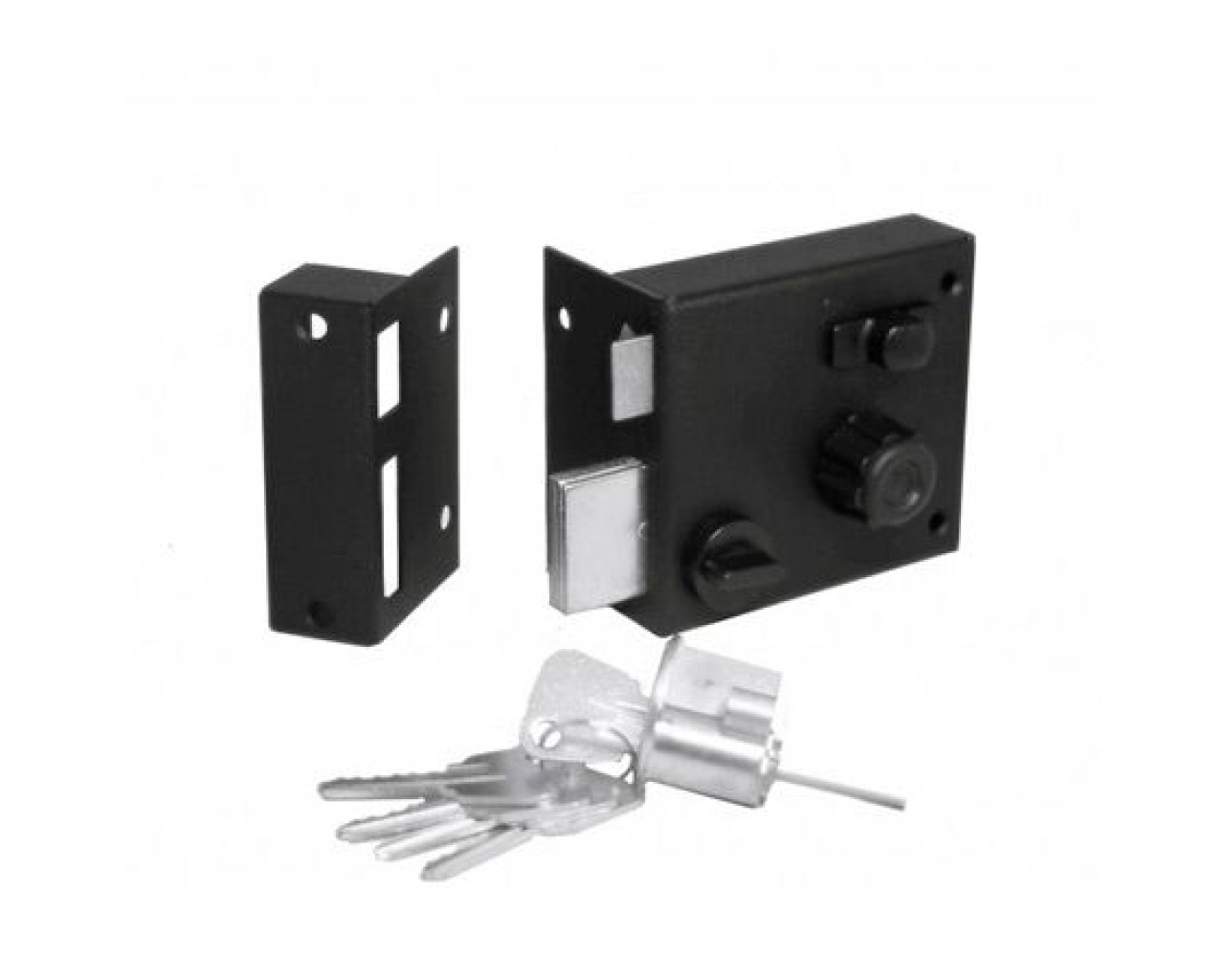Замок накладной цилиндровый с защелкой, вертушкой и фиксатором. Предназначен для установки на деревянные двери. Засов прямоугольного сечения 9х35 мм, с максимальным вылетом 24 мм. Удаление ключевого отверстия - 58 мм. Комплектация - 5 ключей, запорная коробка, накладка.